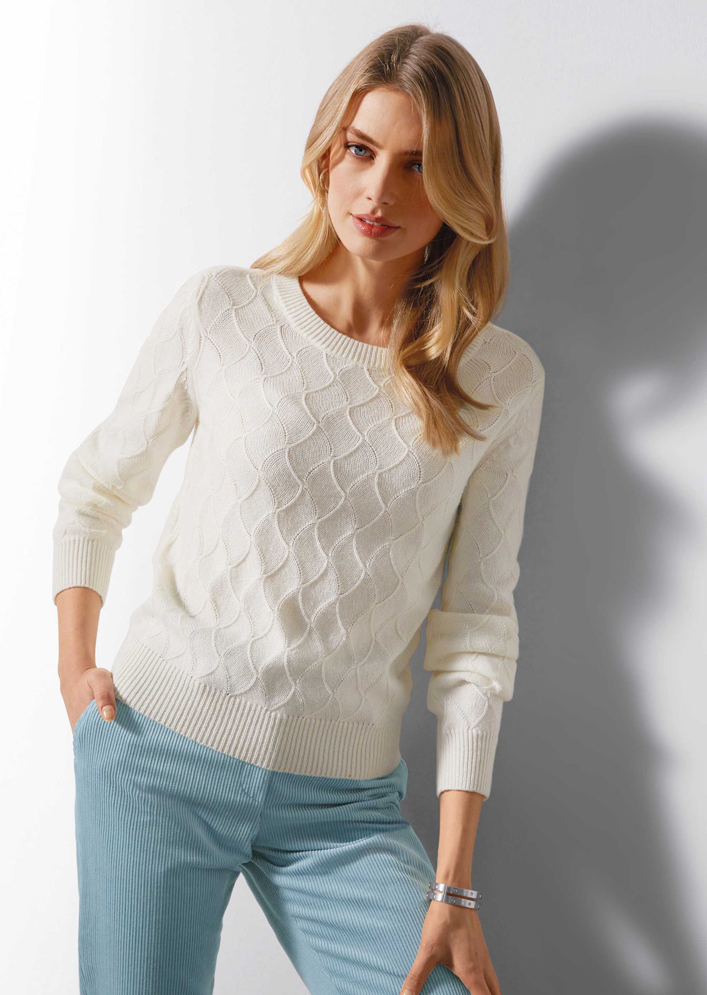 Fin motif ondulé. Tricoté fully fashioned. Profonde encolure arrondie, manches longues et bords-côtes sur l'encolure et à la base.