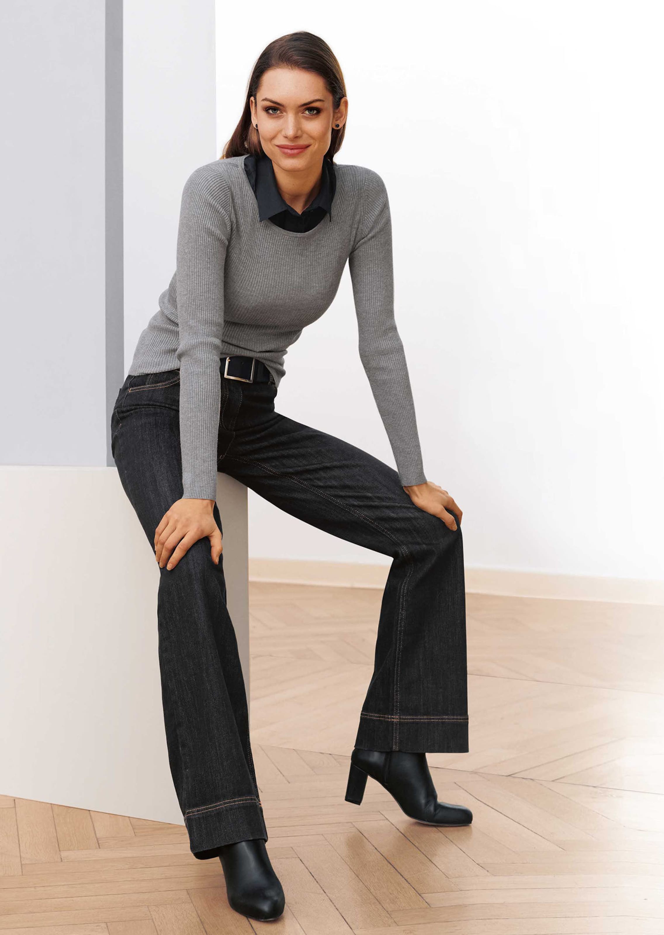 Finition fantaisie sur l'encolure en V. Maille côtelée agréable à porter. Ligne légèrement cintrée et près du corps. Manches longues.