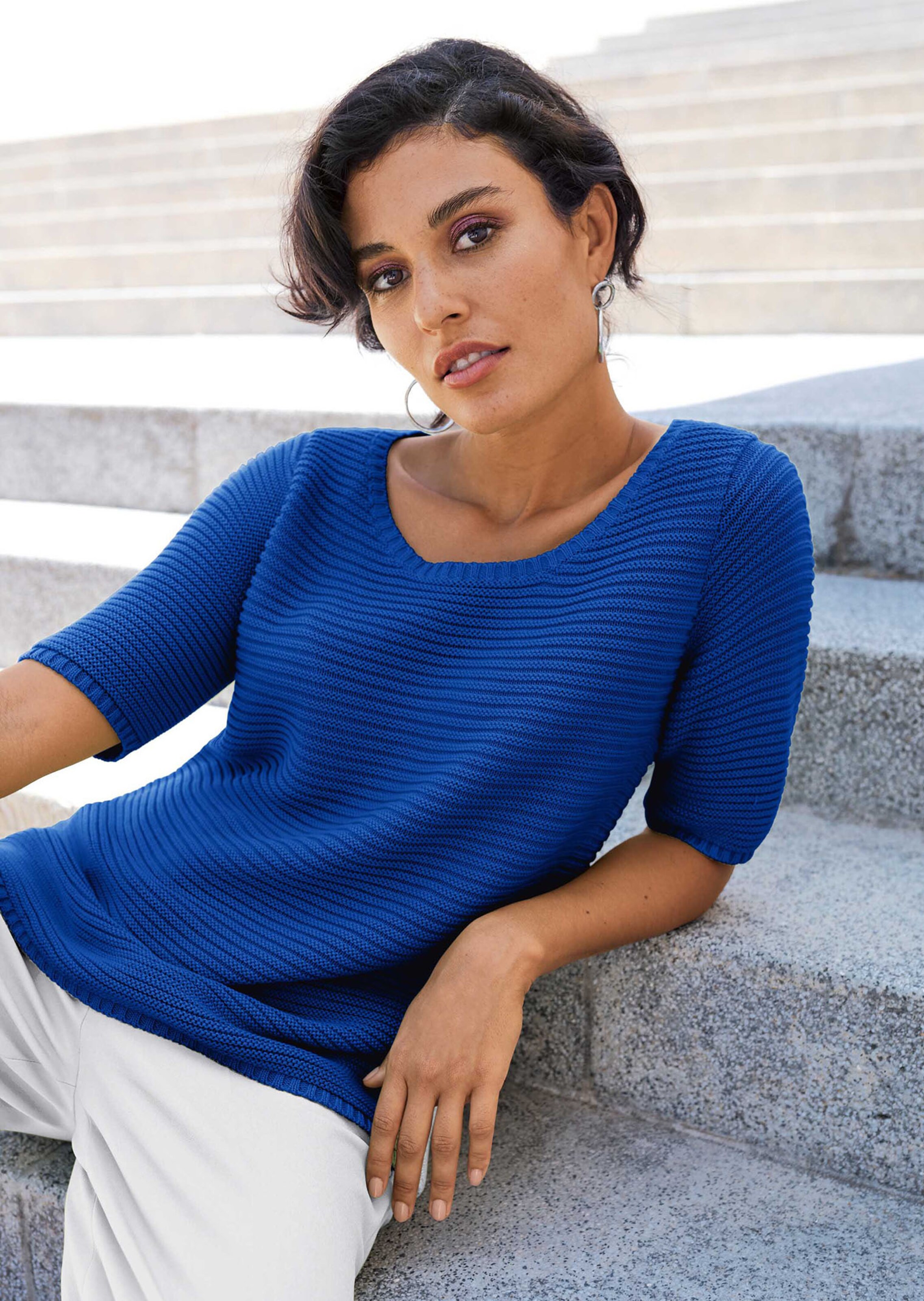 Coton Supima très doux, extrafin. Coupe décontractée. Maille côtelée tendance. Encolure arrondie, manches courtes et fins bords-côtes.