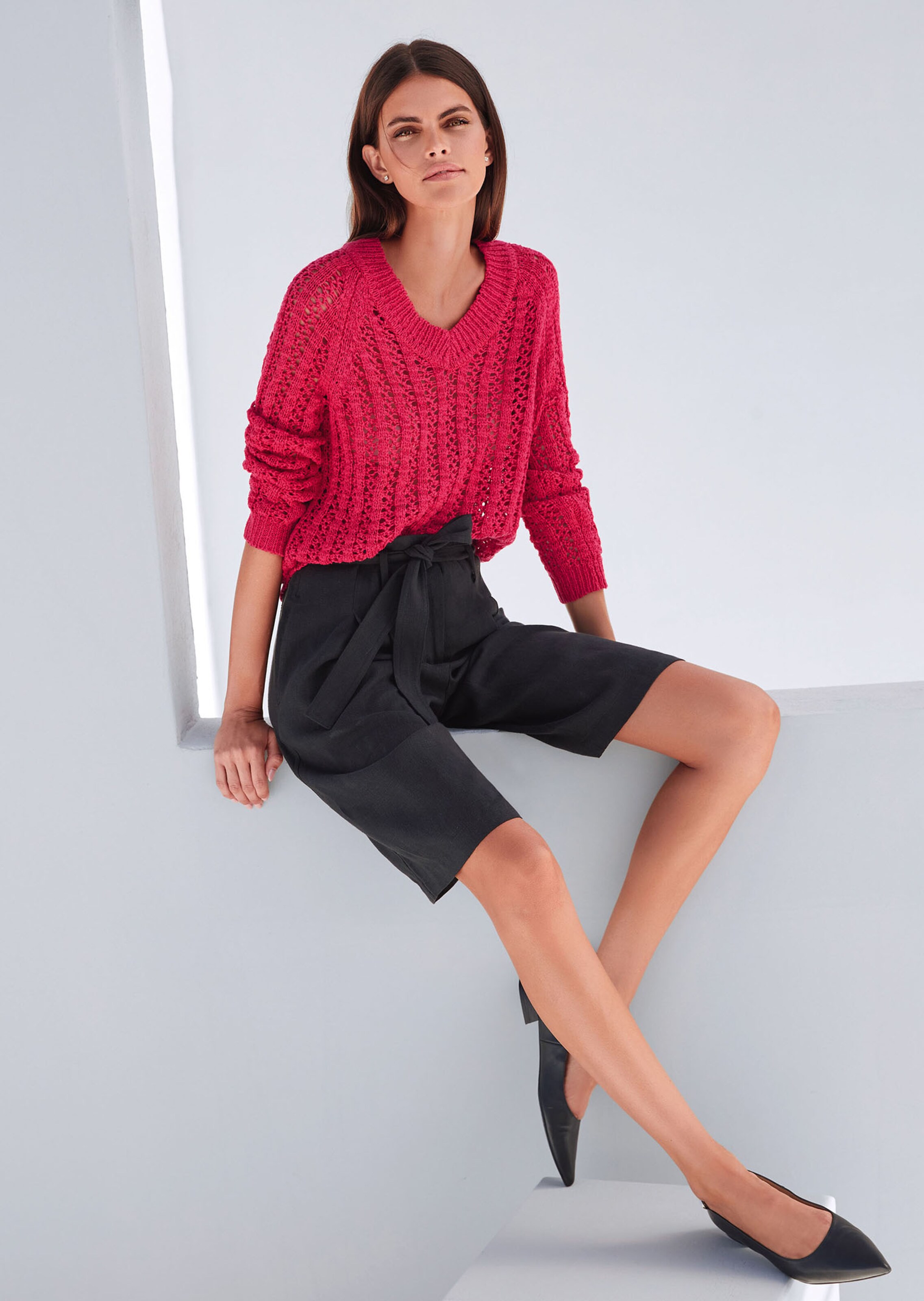 Maille ajourée moderne et agréablement aérée avec encolure en V, manches longues raglan et bordures côtelées aux manches et à la base. Comfort Fit.