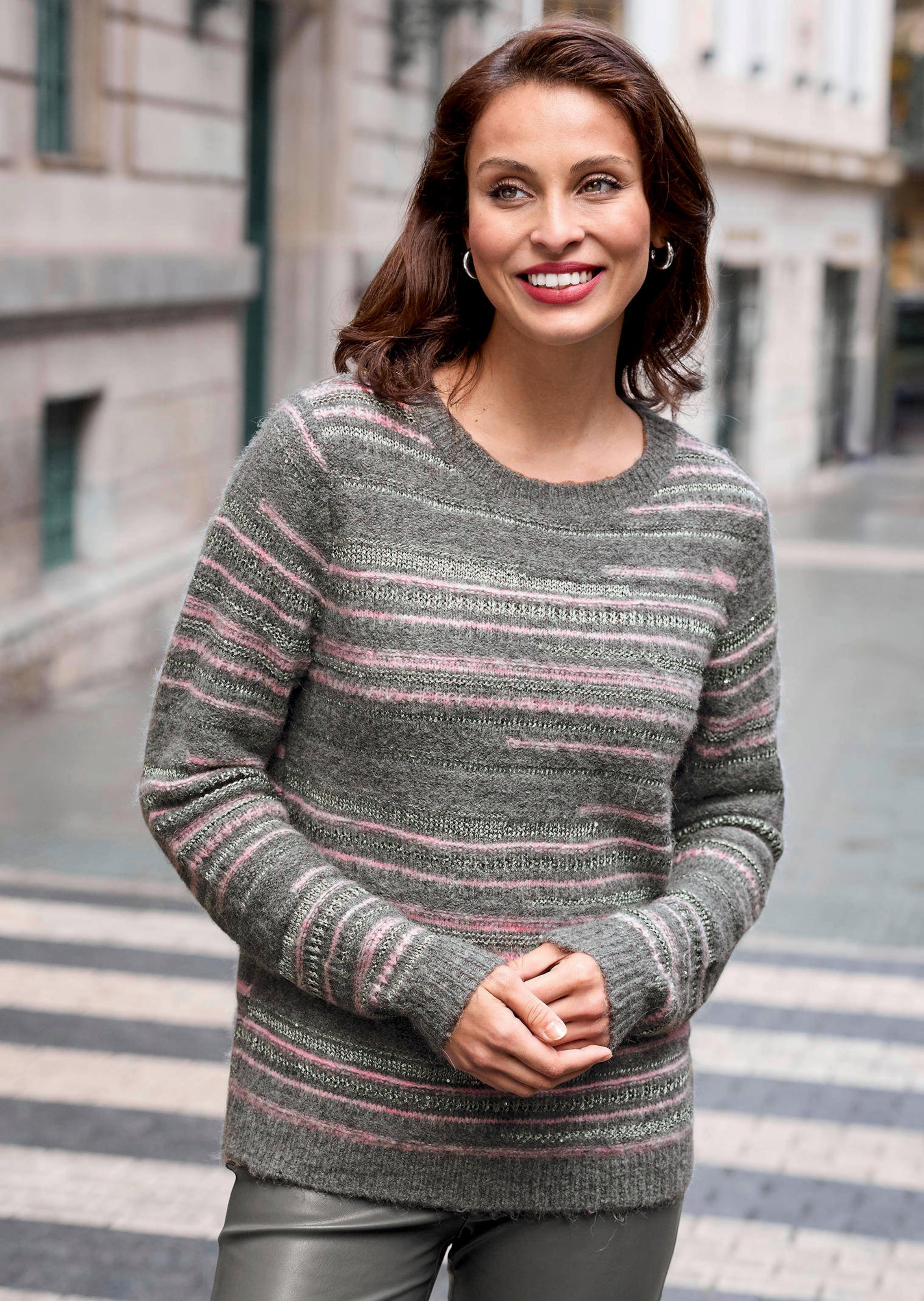 Avec du mohair. Rehaussé de fils fins brillants et de paillettes. Bords-côtes sur l'encolure arrondie, au bas des manches et à la base.