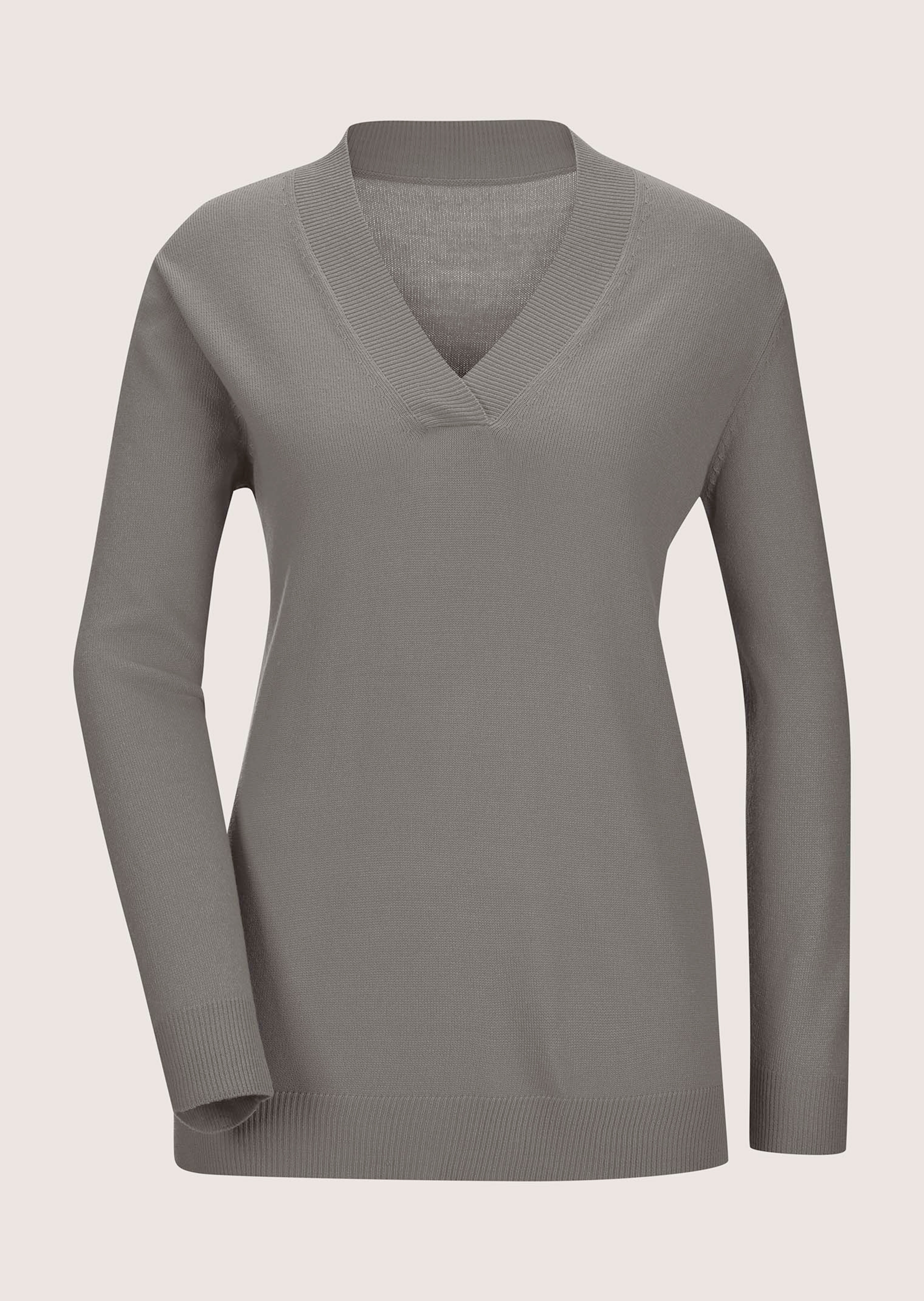 Maille jersey endroit. Profond col V souligné d'un large empiècement croisé. Bords-côtes d'une tenue irréprochable au bas des manches et à la base. Fentes latérales.