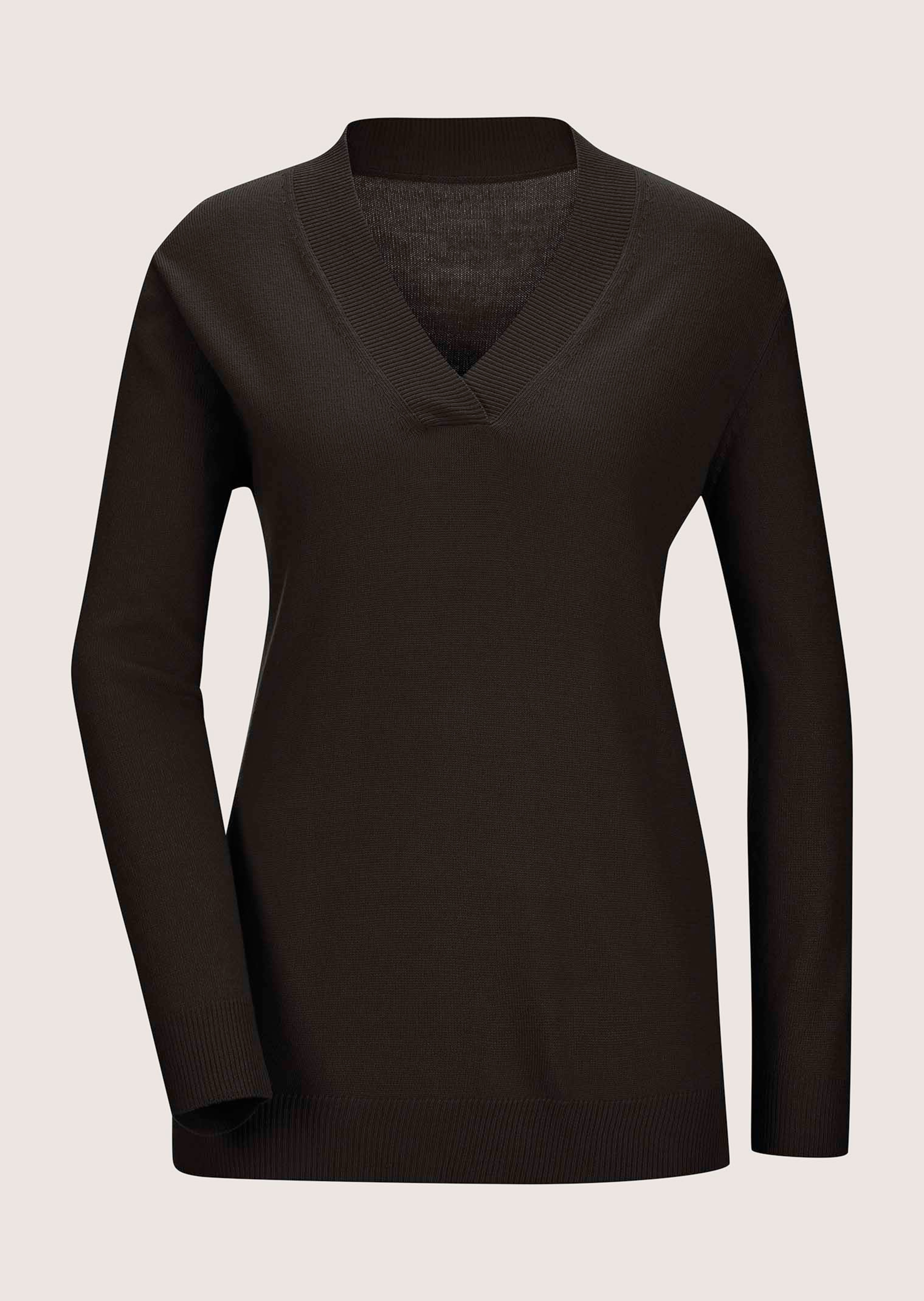 Maille jersey endroit. Profond col V souligné d'un large empiècement croisé. Bords-côtes d'une tenue irréprochable au bas des manches et à la base. Fentes latérales.
