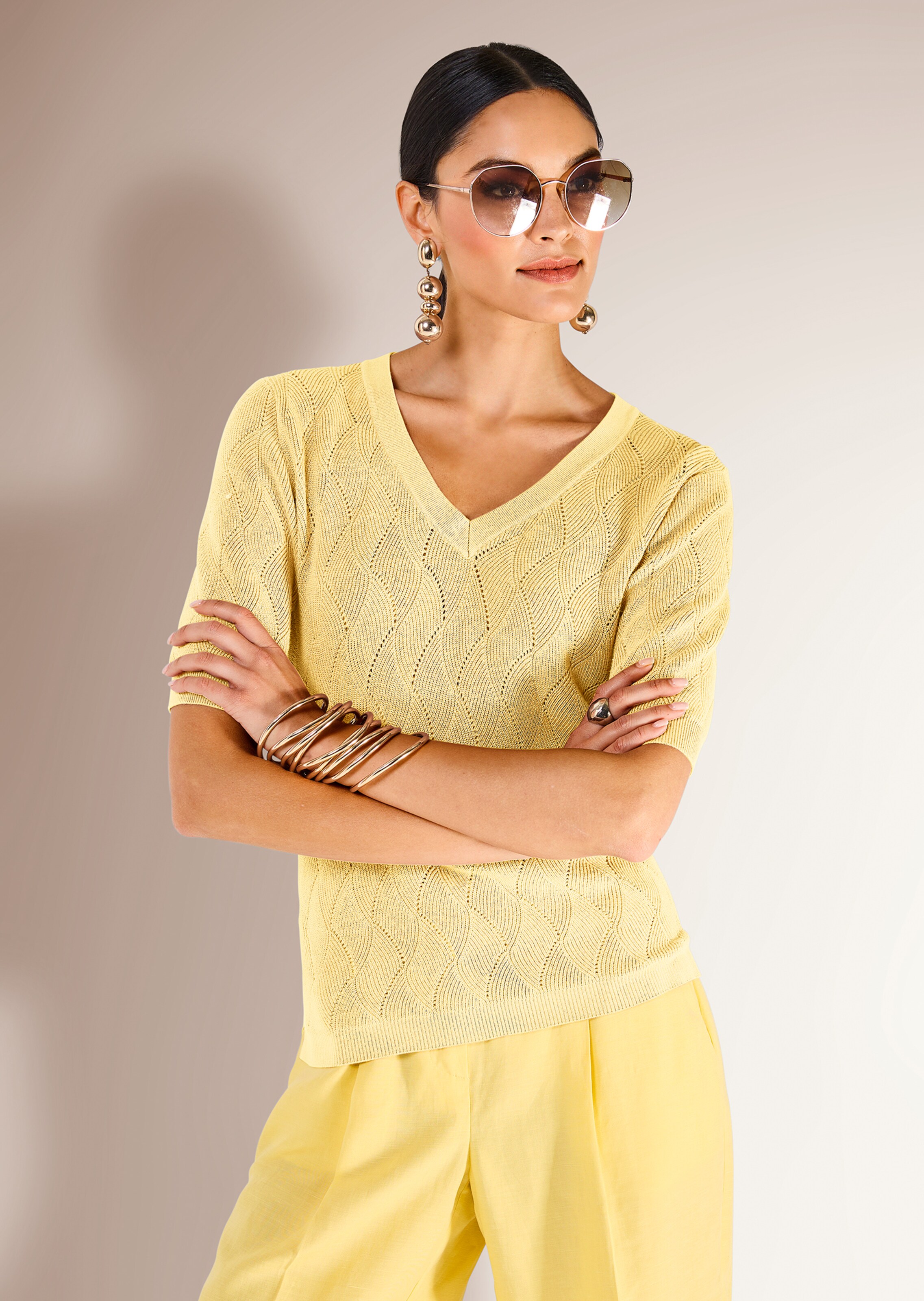 Maille structurée tendance. Encolure en V et manches courtes. Bords-côtes d'une tenue irréprochable au bas des manches et à la base. Petites fentes latérales.