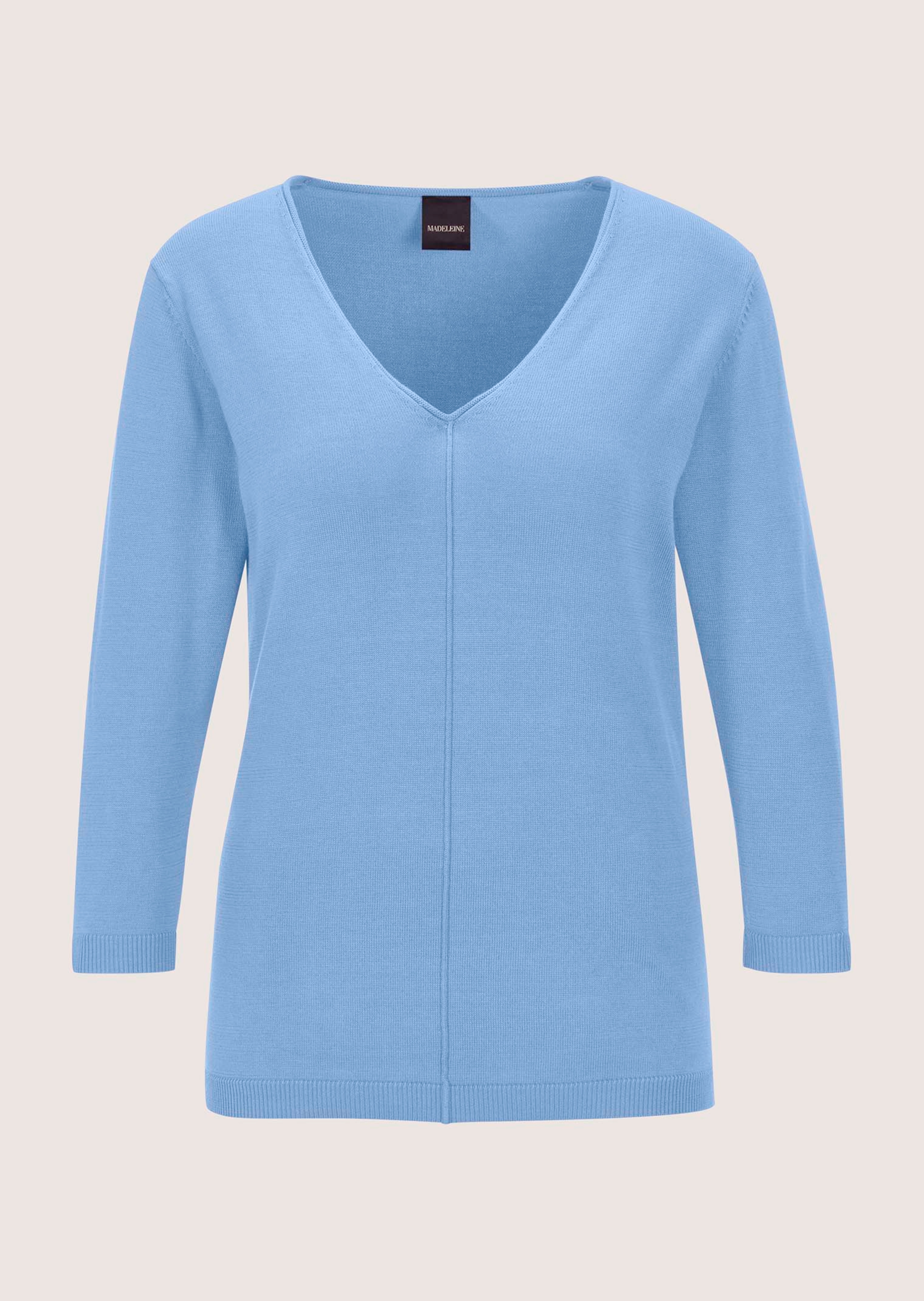 Coton Supima haut de gamme. Couture fantaisie au milieu du devant. Ligne près du corps. Manches longues. Bord roulotté sur l’encolure V. Bords-côtes au bas des manches et à la base fendue sur les côtés.