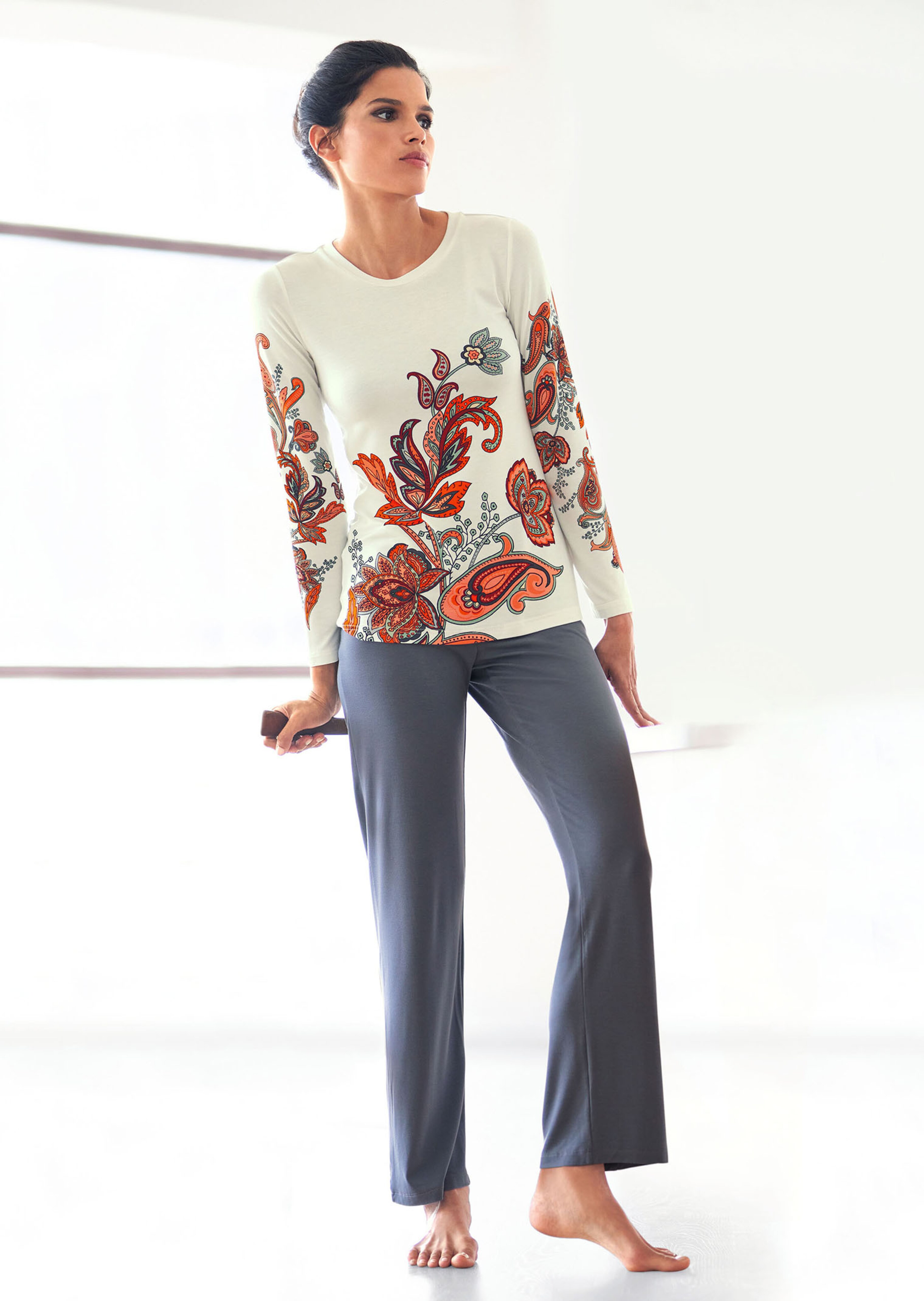 Haut avec imprimé cachemire, manches longues et encolure arrondie. Pantalon uni à la coupe décontractée, avec taille confortable. Matière souple et fluide. Avec fibres de viscose durables de la marque LENZING™ ECOVERO