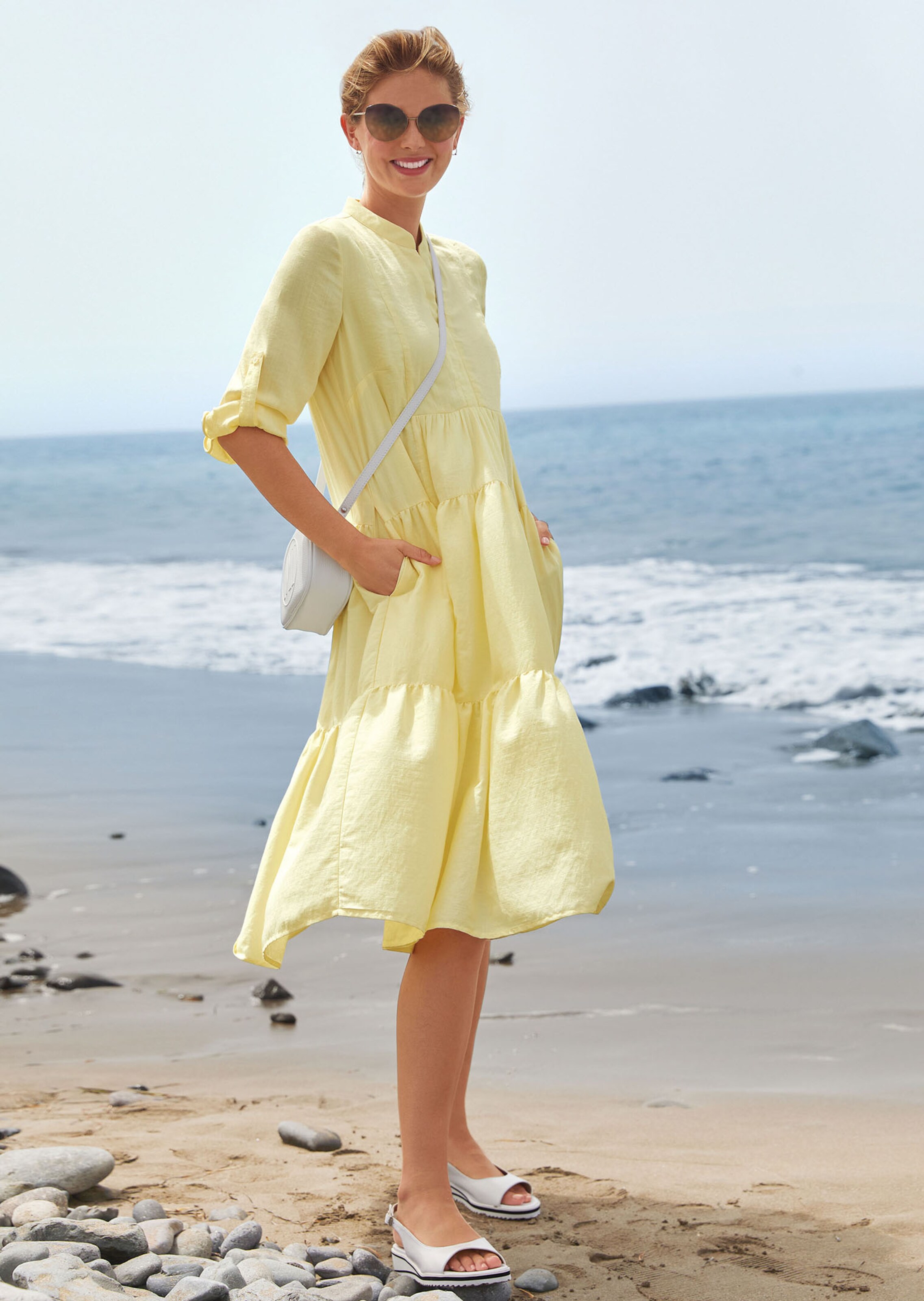 Robe à étages, décontractée, avec jupe virevoltante. Manches à retrousser et poches côté. Mélange de viscose frais.