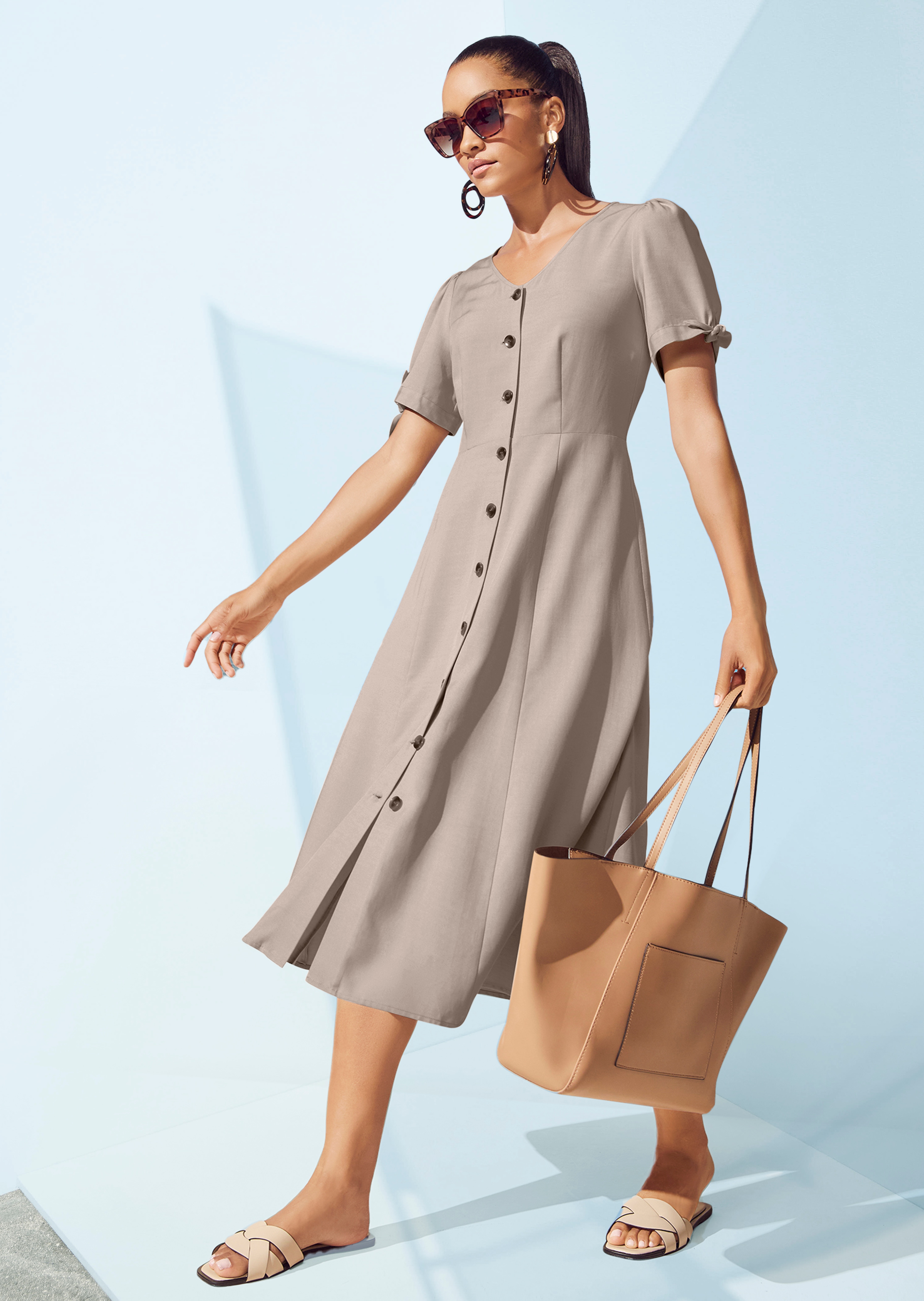Mix de fil doux sur la peau. Coupe féminine cintrée. Entièrement boutonnée. Encolure en V et jupe virevoltante. Manches courtes avec plis en haut et fin empiècement et liens à nouer en bas.