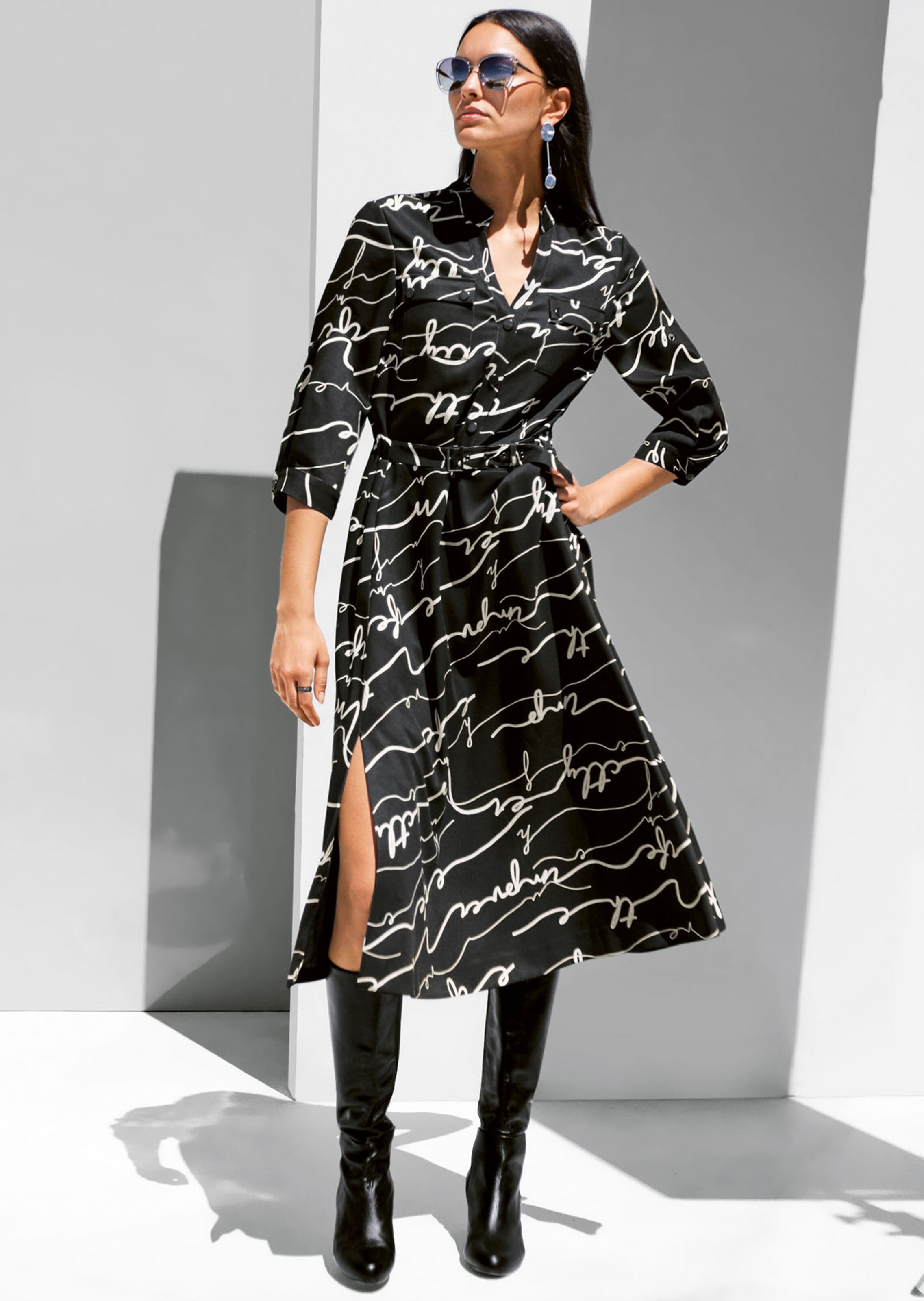 Longueur midi, imprimé unique. Haut entièrement boutonné, avec deux poches poitrine, col montant, encolure en V et manches 3/4 à retrousser. Jupe évasée à l'effet dansant, avec poches côtés et fente latérale. Taille élastiquée avec ceinture fixe fantaisie.