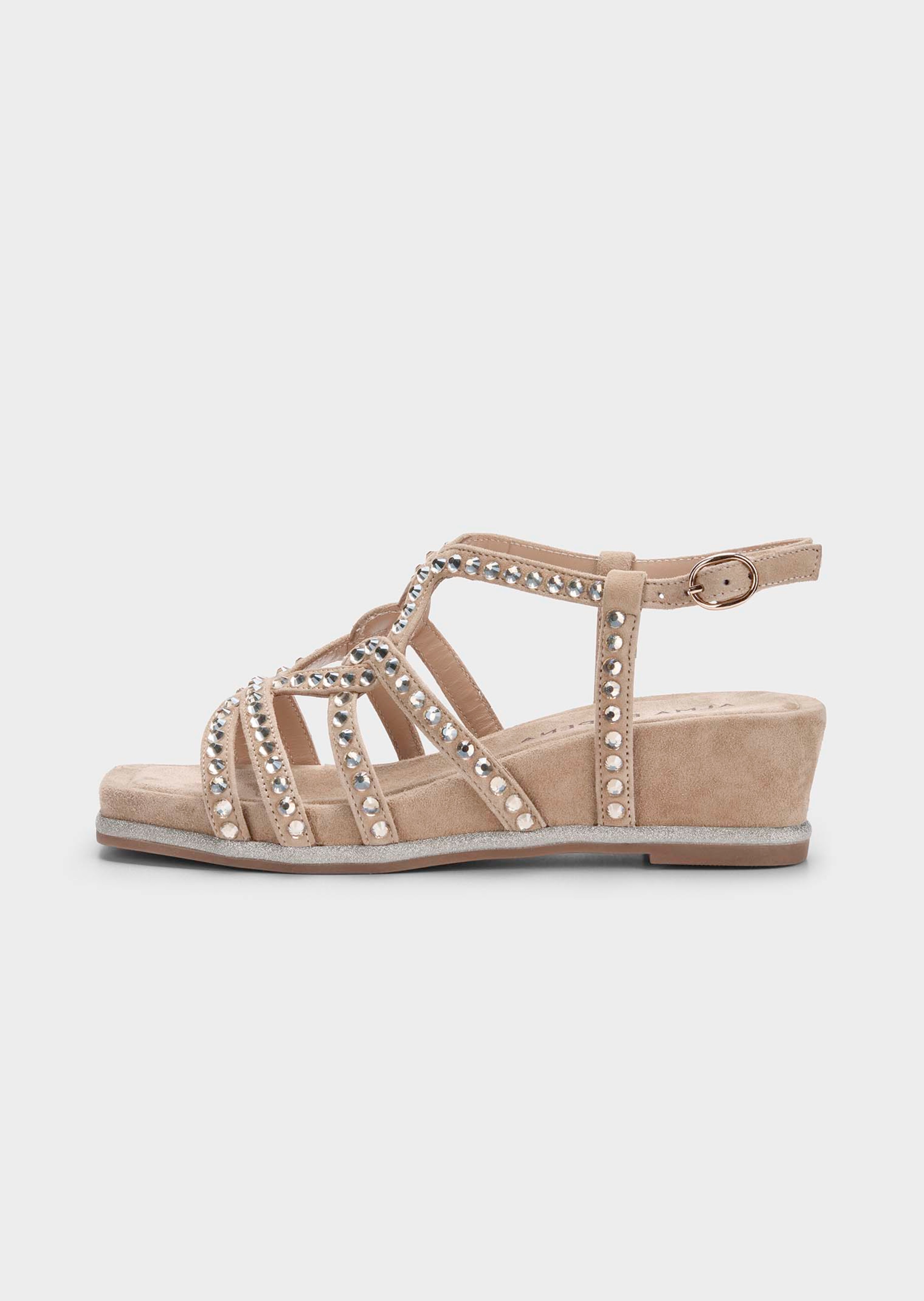 Cuir haut de gamme, avec brides ornées de pierres brillantes et talon compensé. Bride réglable à l’arrière.