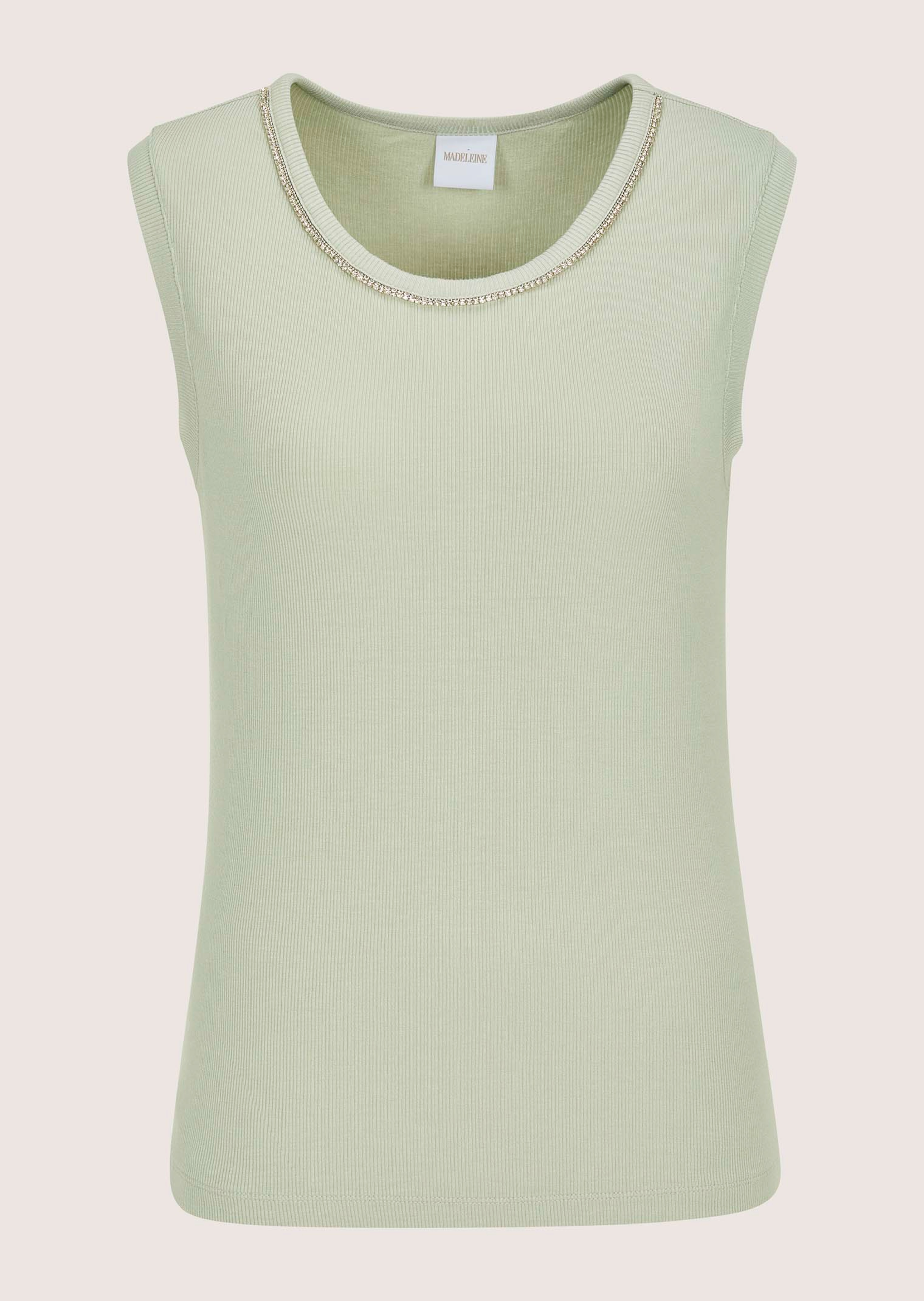 Top en matière côtelée d'une tenue irréprochable, avec ruban en strass sur l'encolure. Très agréable grâce à la matière stretch. Coupe cintrée.