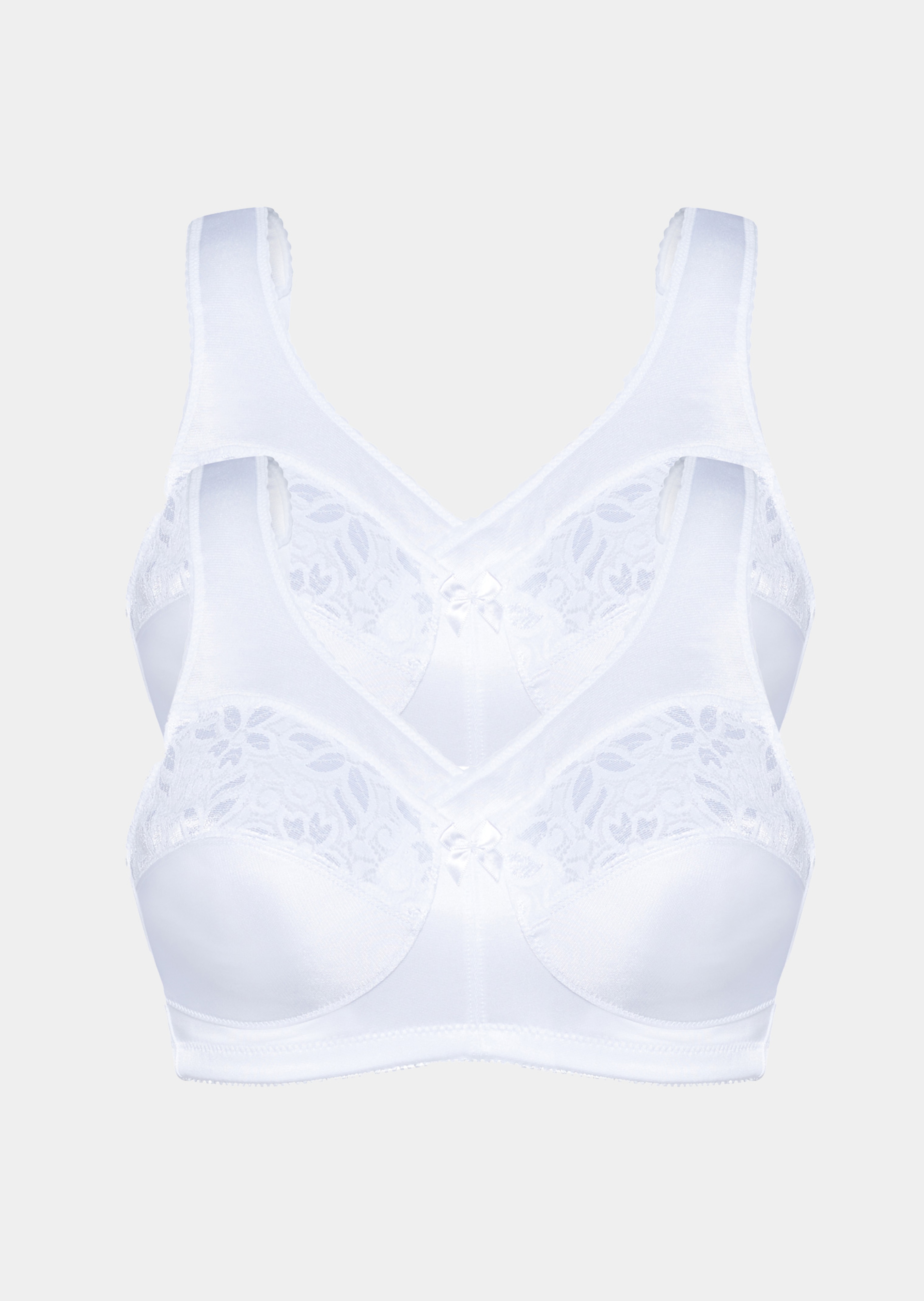 Lot de 2 soutiens-gorge SUSA. Modèle sans armatures qui offre un confort parfait, avec empiècements renforcés, bande de renfort doublée sous la poitrine et bretelles ouatinées. Bonnets à coutures modelantes, avec empiècement en dentelle fleurie sur le haut. Matière lisse et légèrement brillante. Bretelles et fermeture réglables au dos.