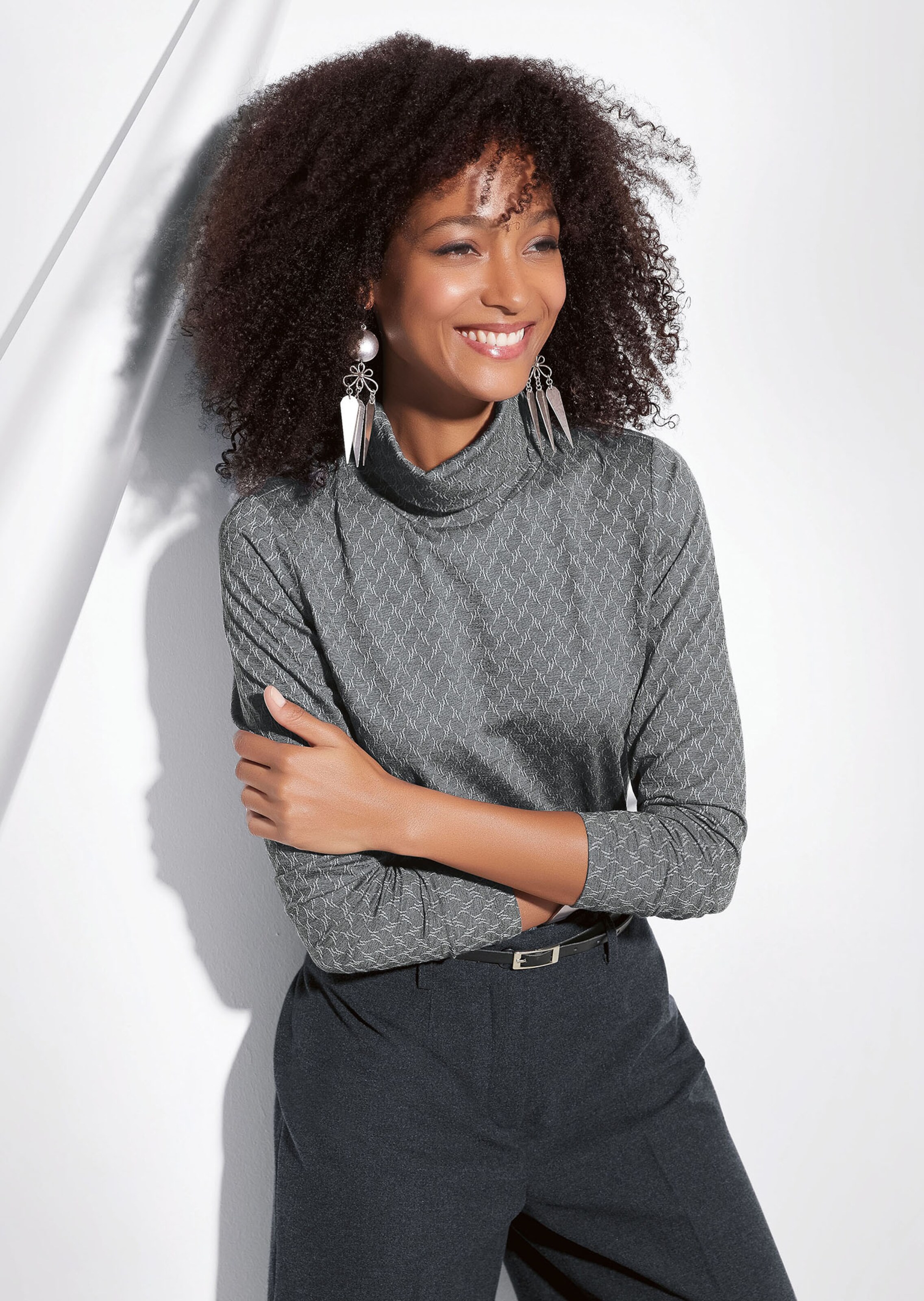 Jersey finement texturé, doux et agréable. Ligne ajustée. Col roulé et manches longues.