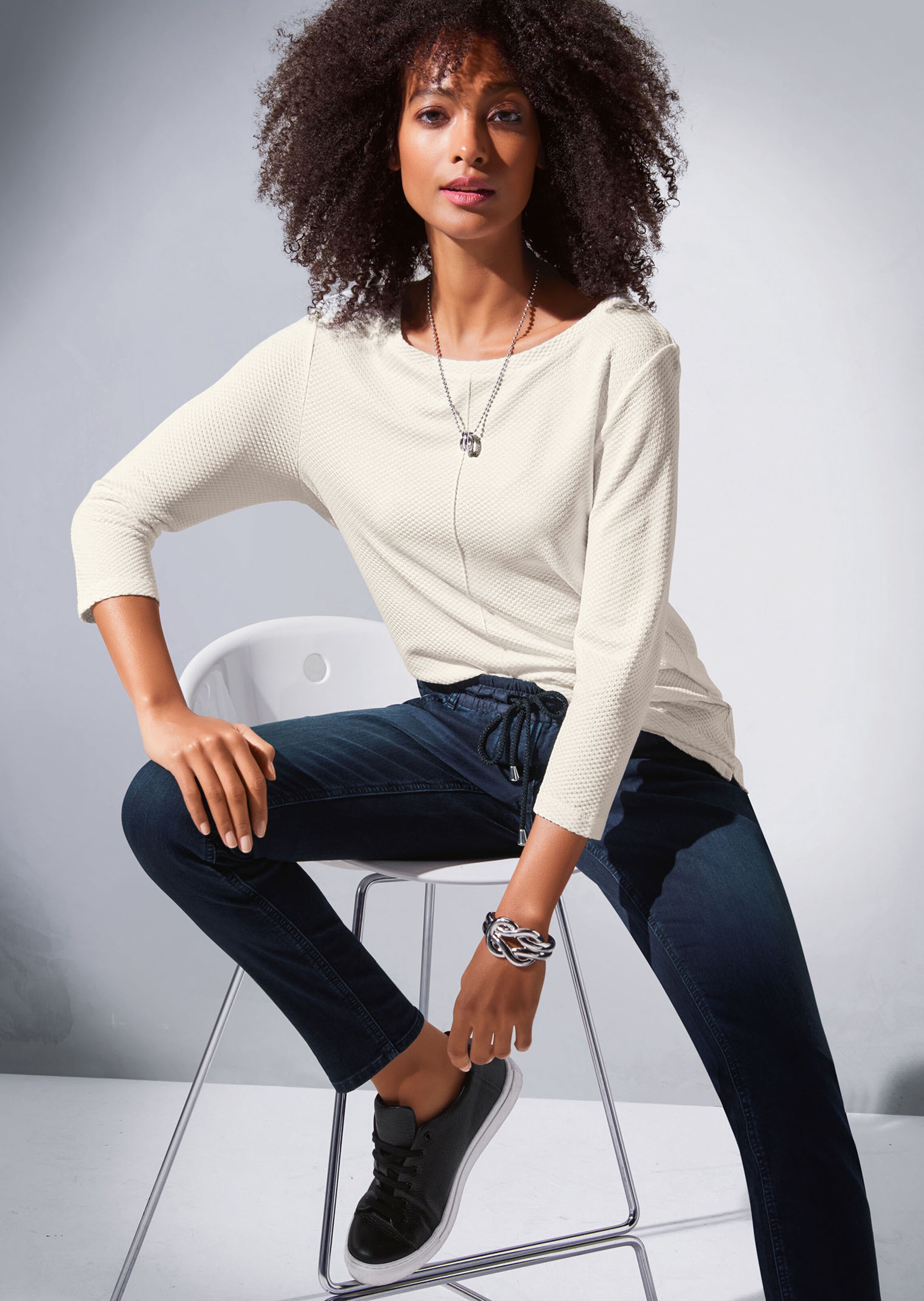 Modèle tendance au confort incomparable. Matière légère et extensible à l'élégante structure cloquée. Ligne légèrement cintrée. Encolure bateau, manches 3/4 et petites fentes sur les côtés. Avec des fibres de viscose durables de la marque LENZING™ ECOVERO™.