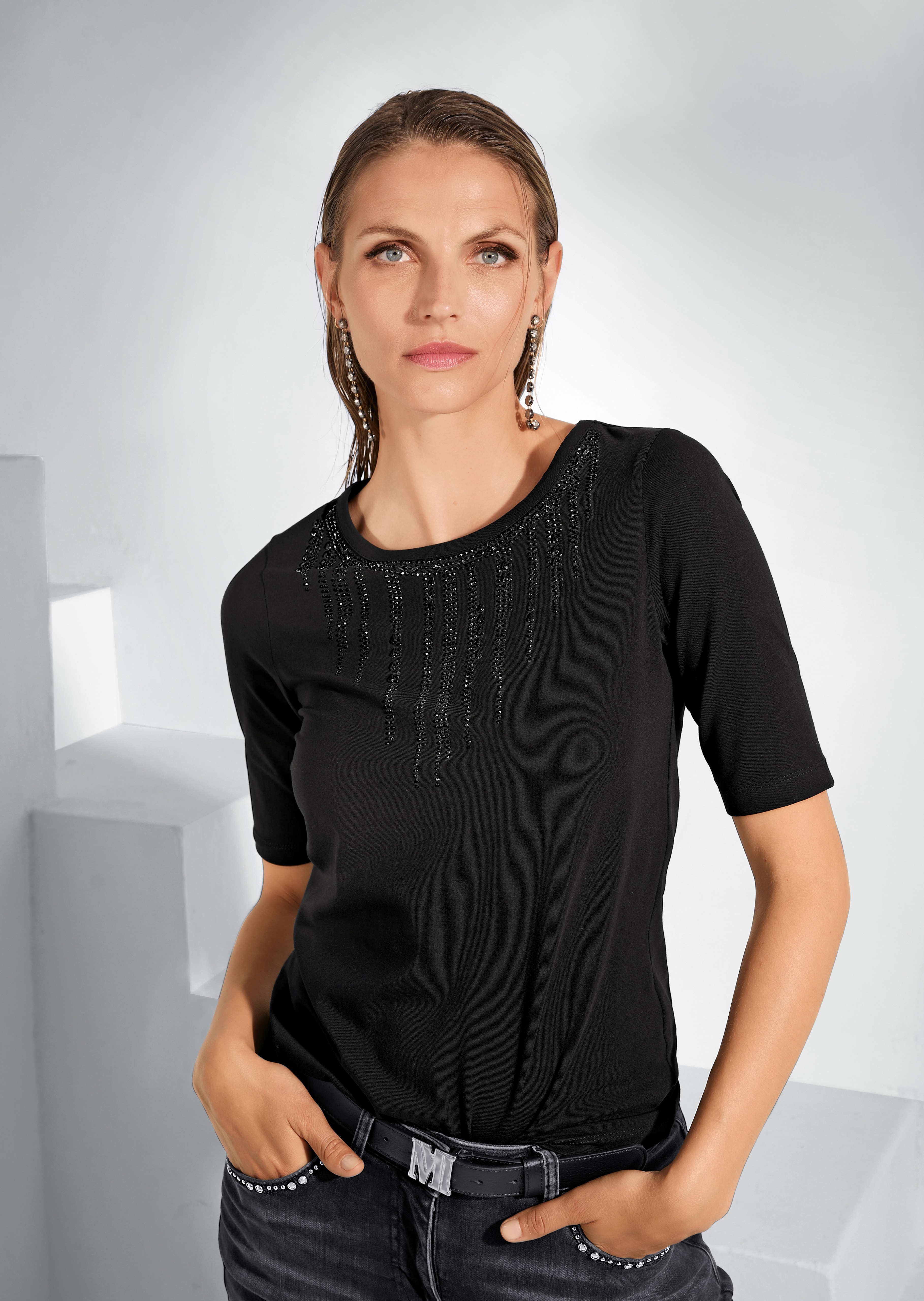 Confortable coton stretch. Coupe cintrée féminine. Encolure arrondie et manches coudes. Applications en strass assorties sur le décolleté.