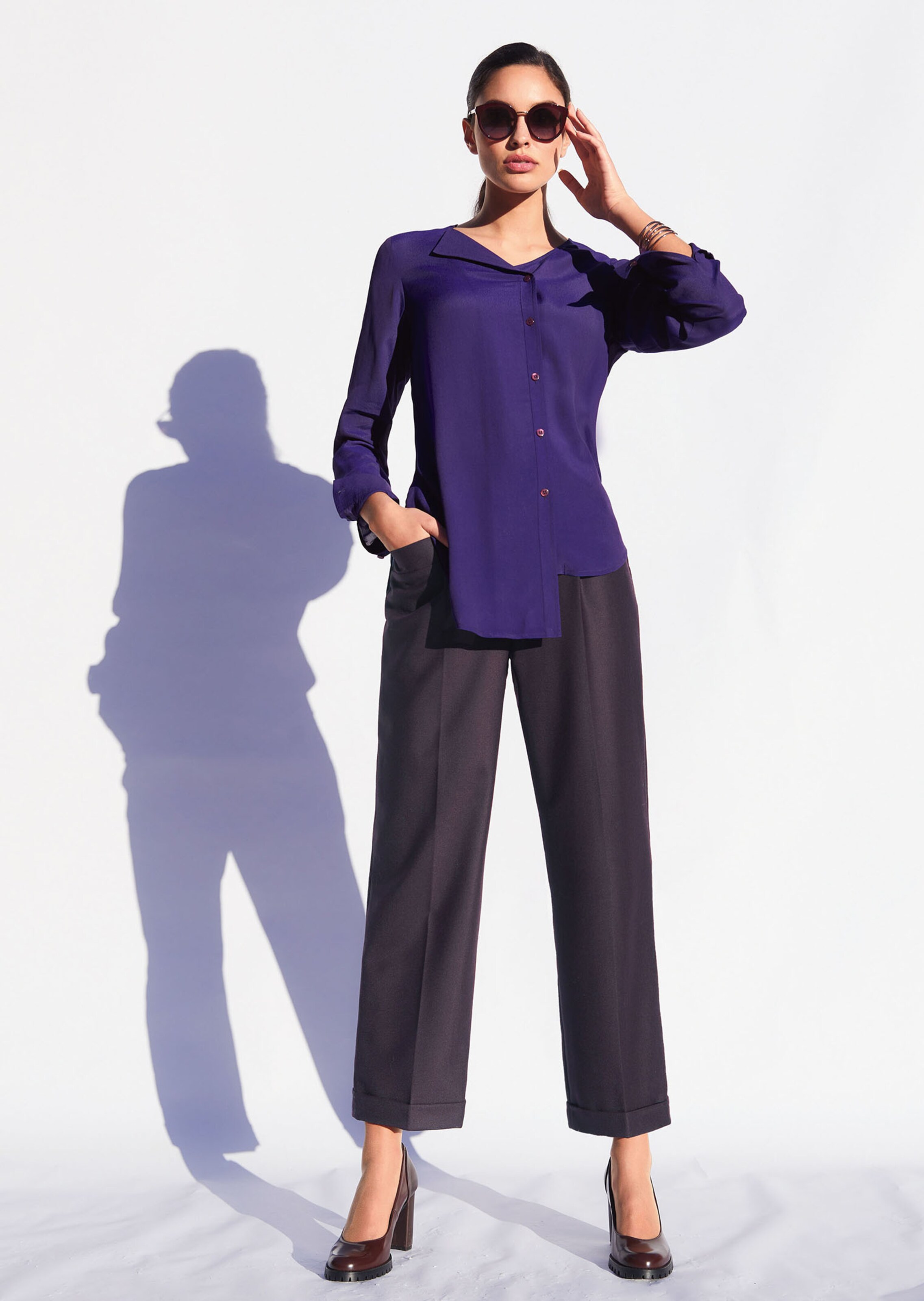 Modèle stylé à revers facile à coordonner. Certifié selon Standard 100 by OEKO-TEX®. Coupe droite à taille haute avec pinces. Découpes, plis marqués, poches côtés et fausse poche au dos.
