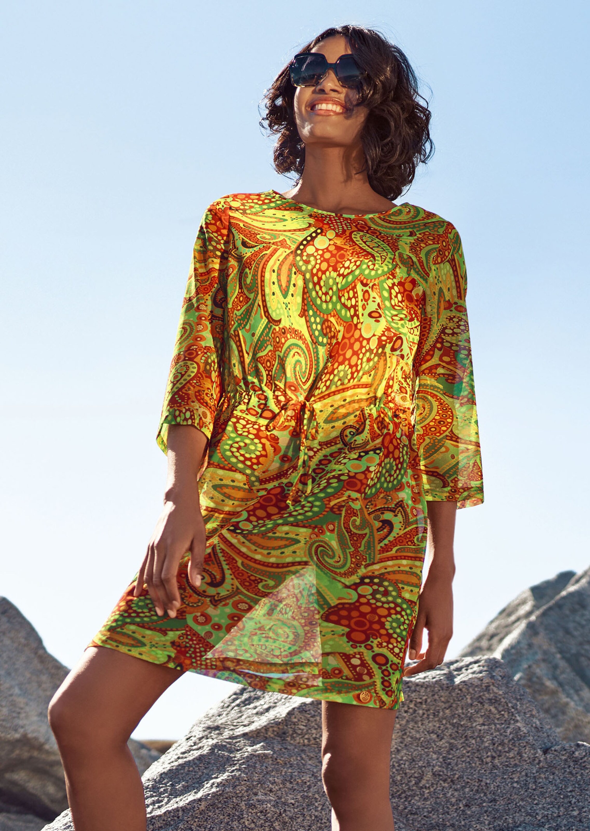 Élégant modèle de plage légèrement transparent, avec imprimé unique aux coloris lumineux. Coupe décontractée. Manches 3/4, encolure arrondie et ruban coulissant à la taille.
