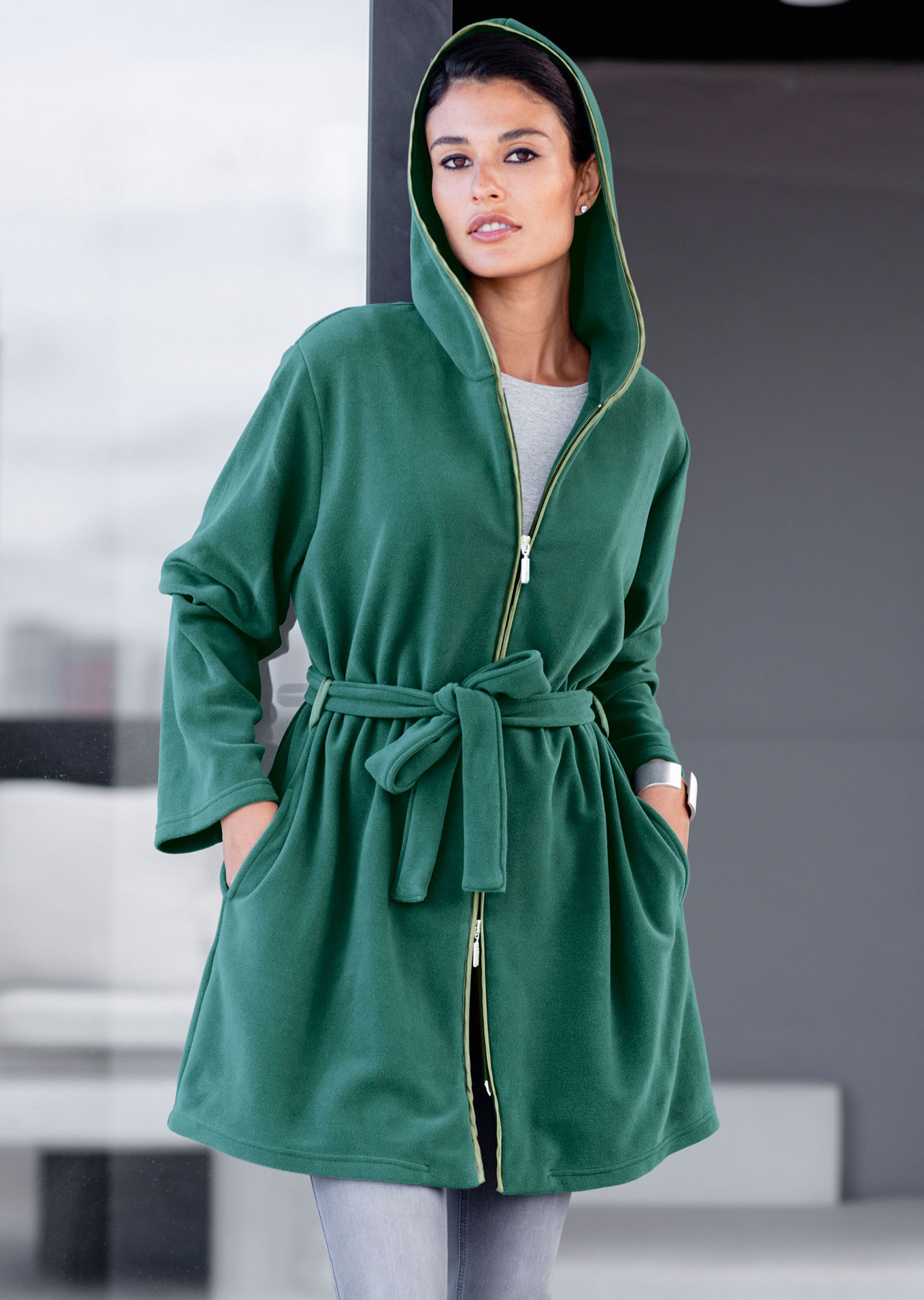 Deux en un : la veste longue est une pièce polyvalente et se marie avec tout pour créer un style décontracté ou mode, selon l’envie. Forme longue avec fermeture à glissière passepoilée, ceinture et 2 poches.