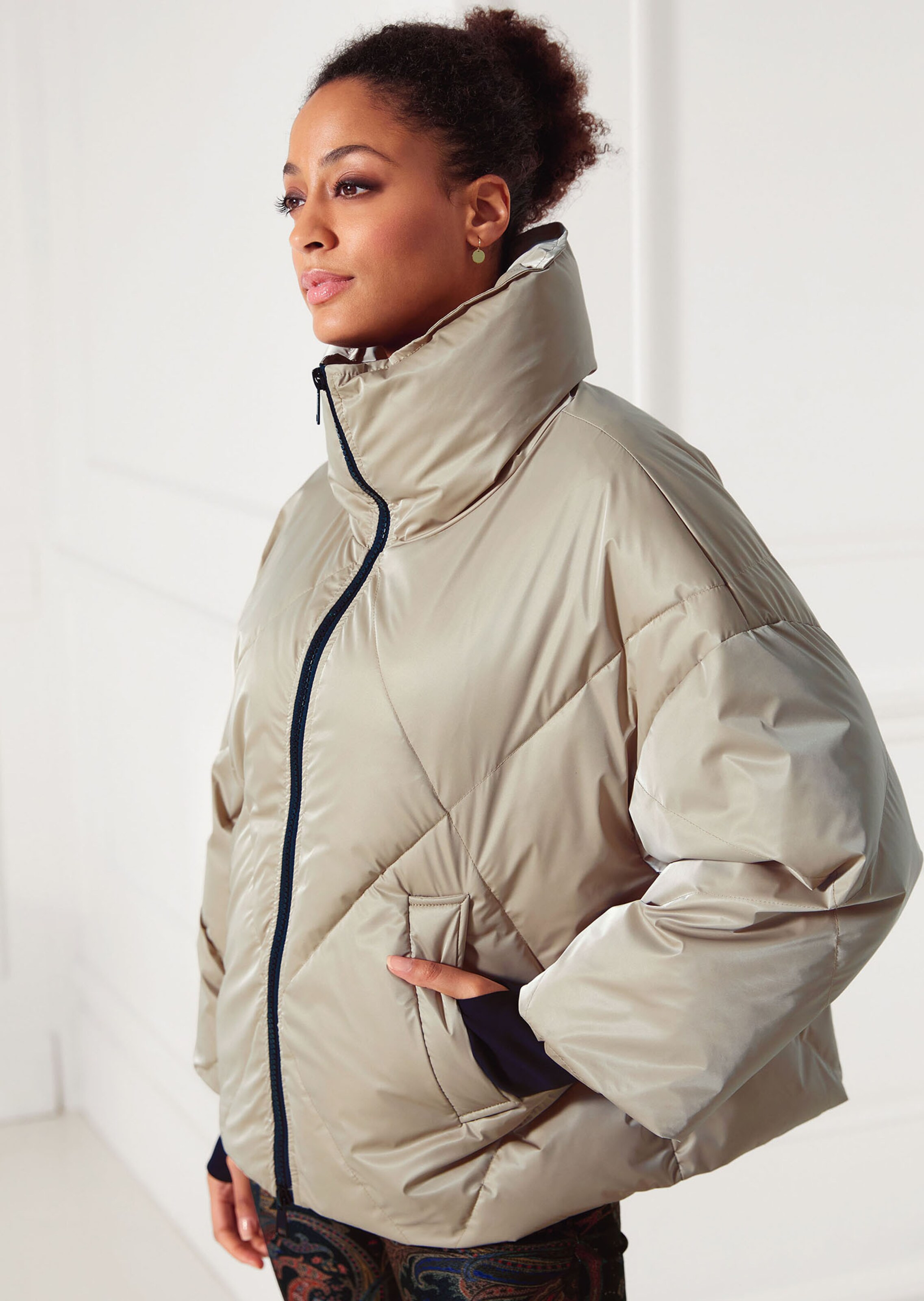 Matelassage losange. Coupe maxi tendance. Col montant, zip double curseur, poches côtés et manches avec poignets coupe-vent. Cordon de serrage réglable à la base.