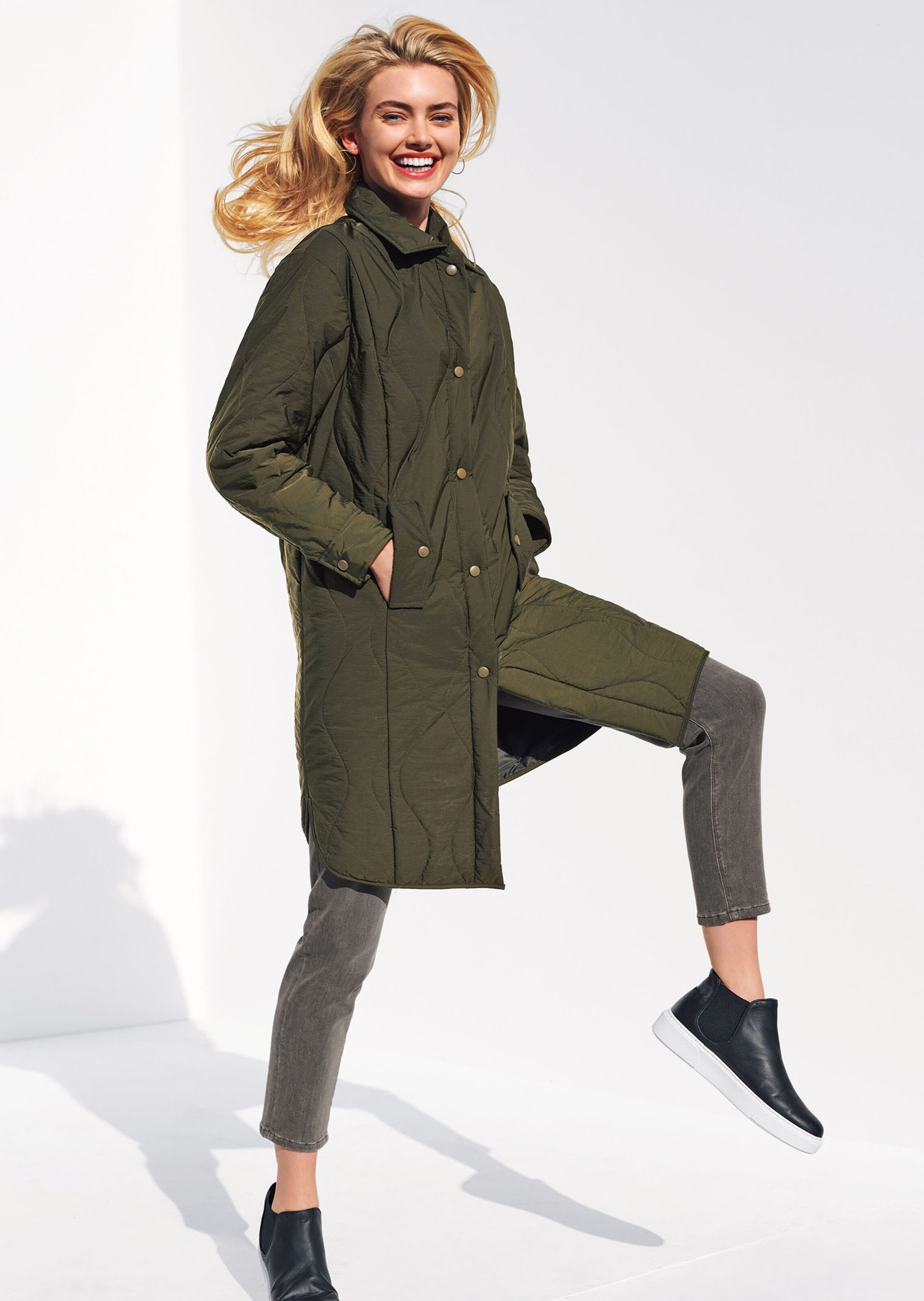 Modèle léger avec chaud ouatinage. Style décontracté. Col montant, épaules descendues et zip double curseur sous patte pressionnée. Poches pressionnées en biais sur les côtés et manches longues avec poignets coupe-vent.