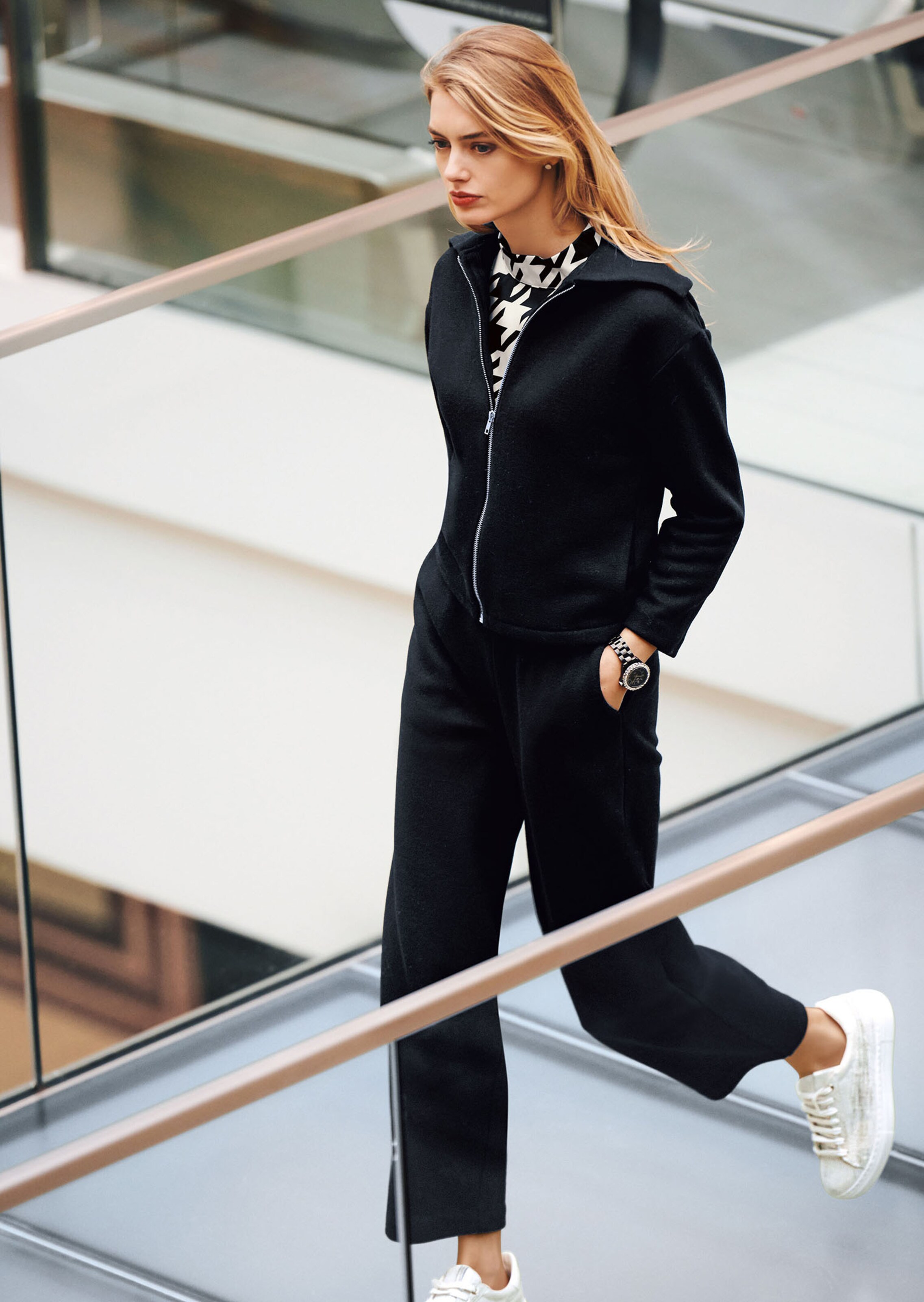 Een sportief trendmodel in prachtige tricot-look. Casual style met een om te vouwen kraag, aangeknipte schouderpartij, ritssluiting en twee steekzakken.