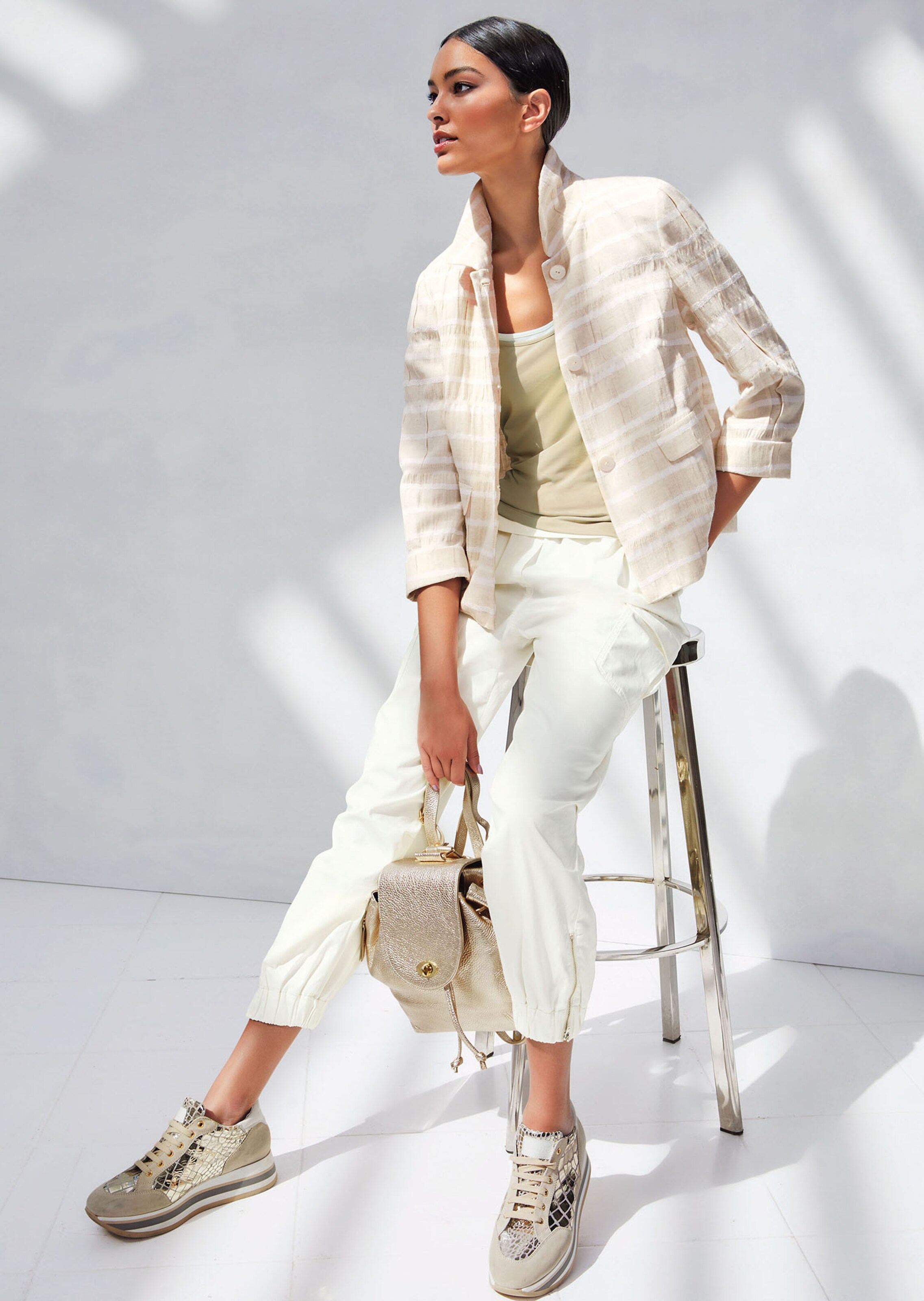 Aangenaam lichte, natuurlijke garenmix met kreukeffect en parelmoeren knopen. Recht, boxy model met verkorte mouwen met omslag en opgestikte klepzakken.