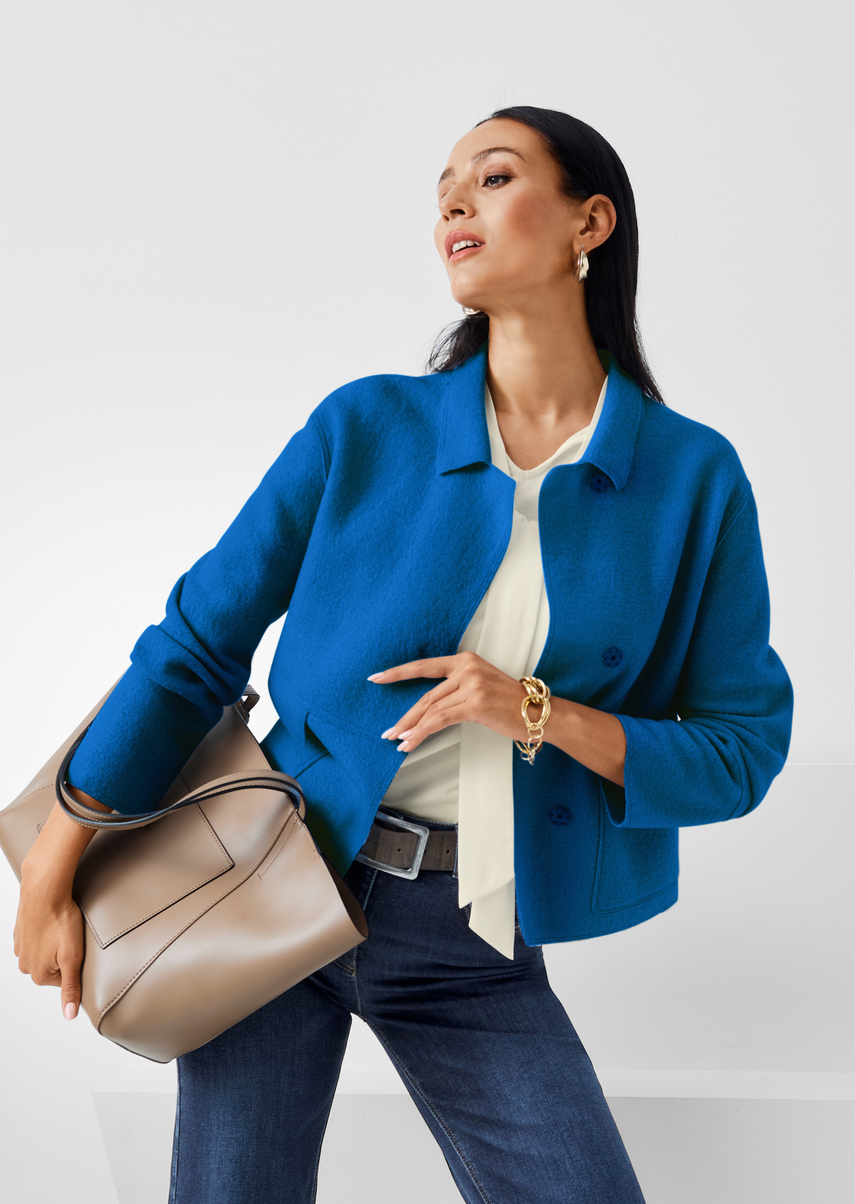Hoogwaardige, natuurlijke kwaliteit, waardevol qua textuur. In modieus kort model met kleine, om te vouwen kraag, blinde drukknopen, grote opgestikte klepzakken en open zoomranden. Deelnaden aan de lange mouwen voor een geraffineerde manchetlook.