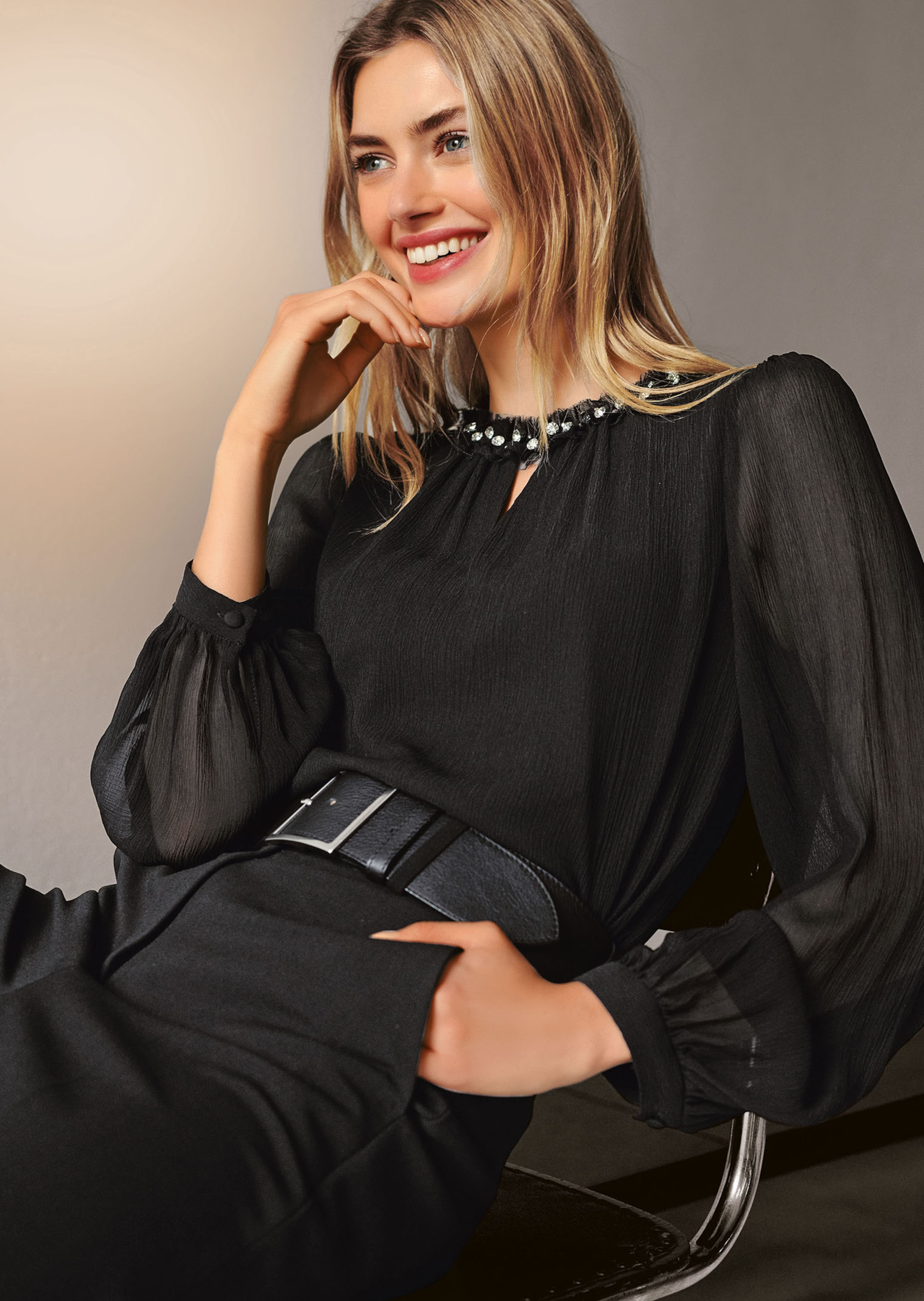 Met fonkelende stras en sierparels aan de halslijn. Sexy vormgegeven met kleine V-split, knoopsluiting met lusjes aan de achterkant, lange mouwen en dichtgeknoopte mouwomslag.