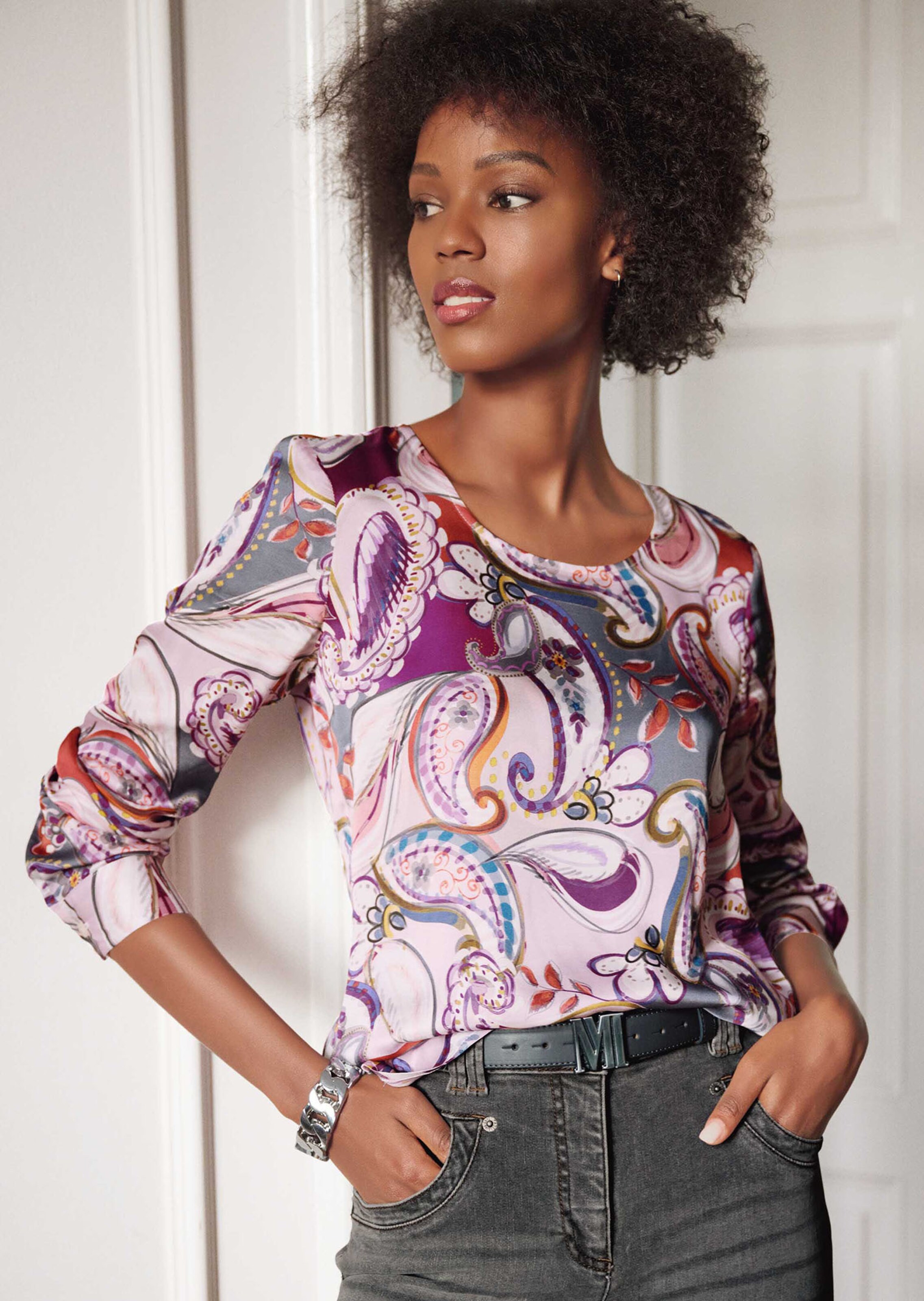 Met paisleypatroon. Elk model is uniek. Casual shirtstijl met ronde hals, splitjes opzij en lange mouwen met manchetten.