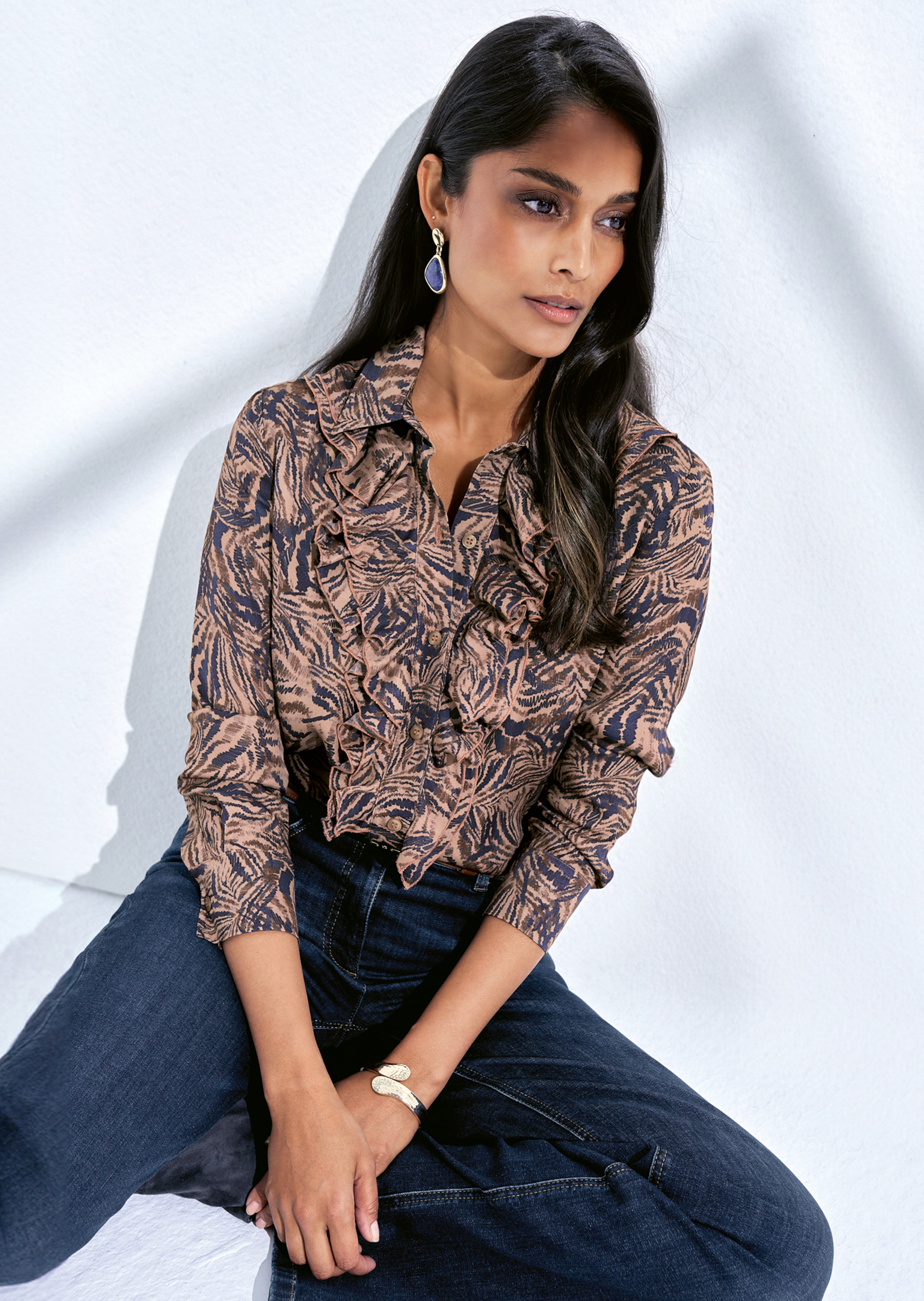 Soepel vallende viscose met afgeronde zoomrand. Met modieus elegant beleg met ruches, pas op de rug en stolpplooi. De overhemdkraag, de knopenlijst en de lange manchetmouwen zijn klassieke details.
