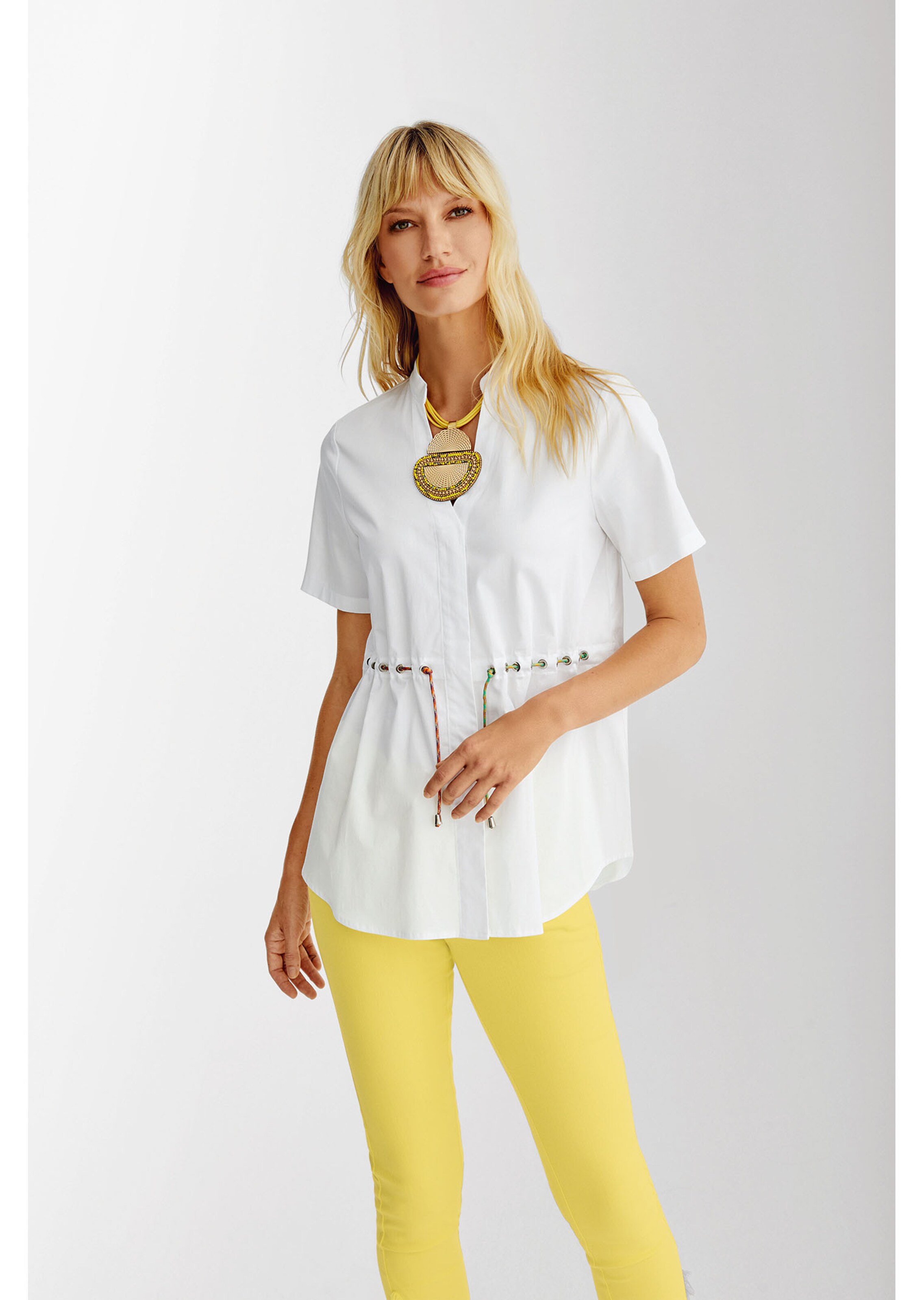 Met kleurrijk trekkoord in de taille. Casual stijl met diepe V-hals, kleine opstaande kraag, afgeronde zoom, logoknopen, korte mouwen en blinde knoopsluiting. Met zilverkleurige oogjes en zilverkleurige koordstoppers.