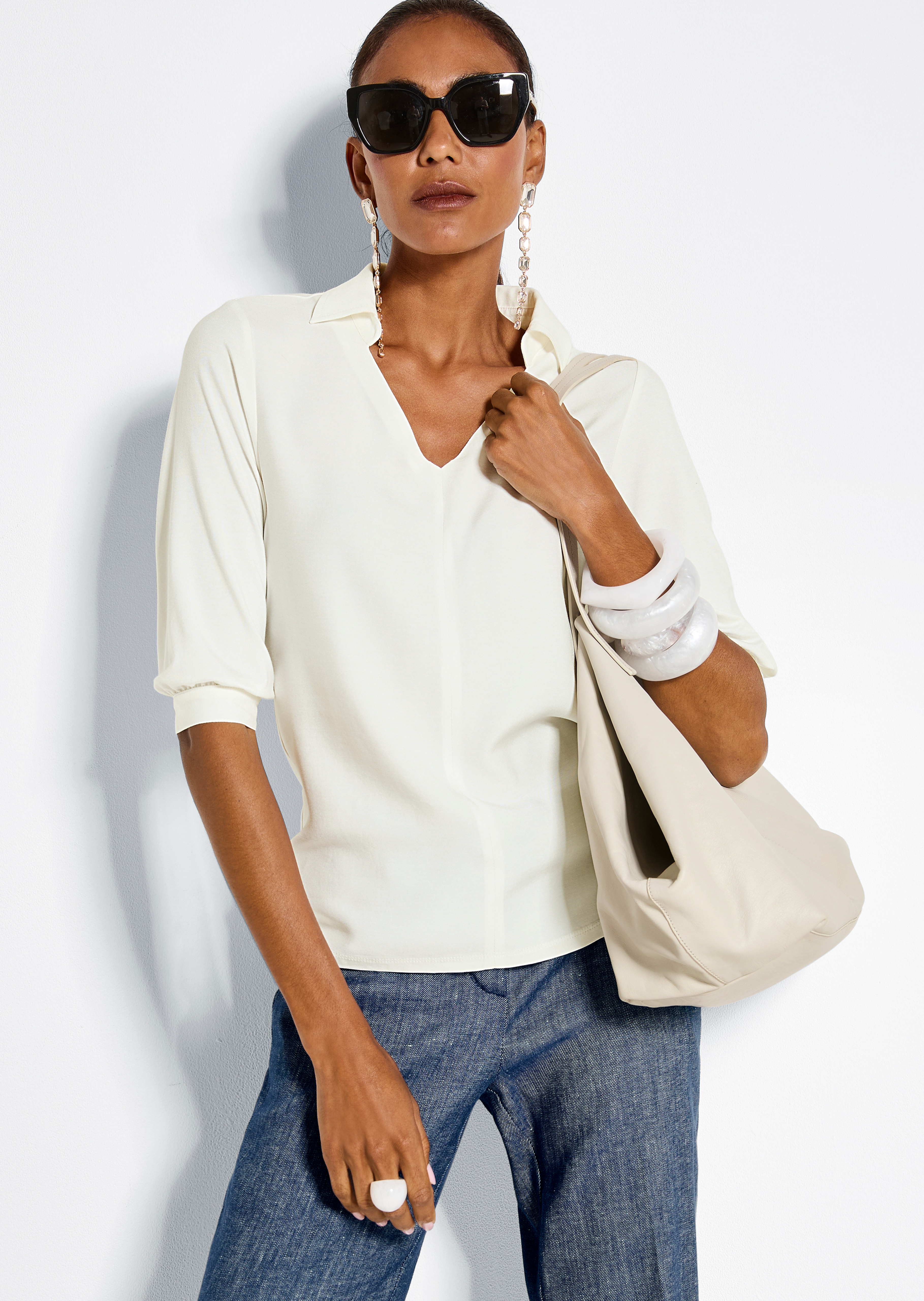 De kraag met V-hals en de naad middenvoor zorgen voor een geweldige look. De halflange mouwen met smalle manchetten, splitje en fijne rimpels maken het cleane ontwerp compleet.
