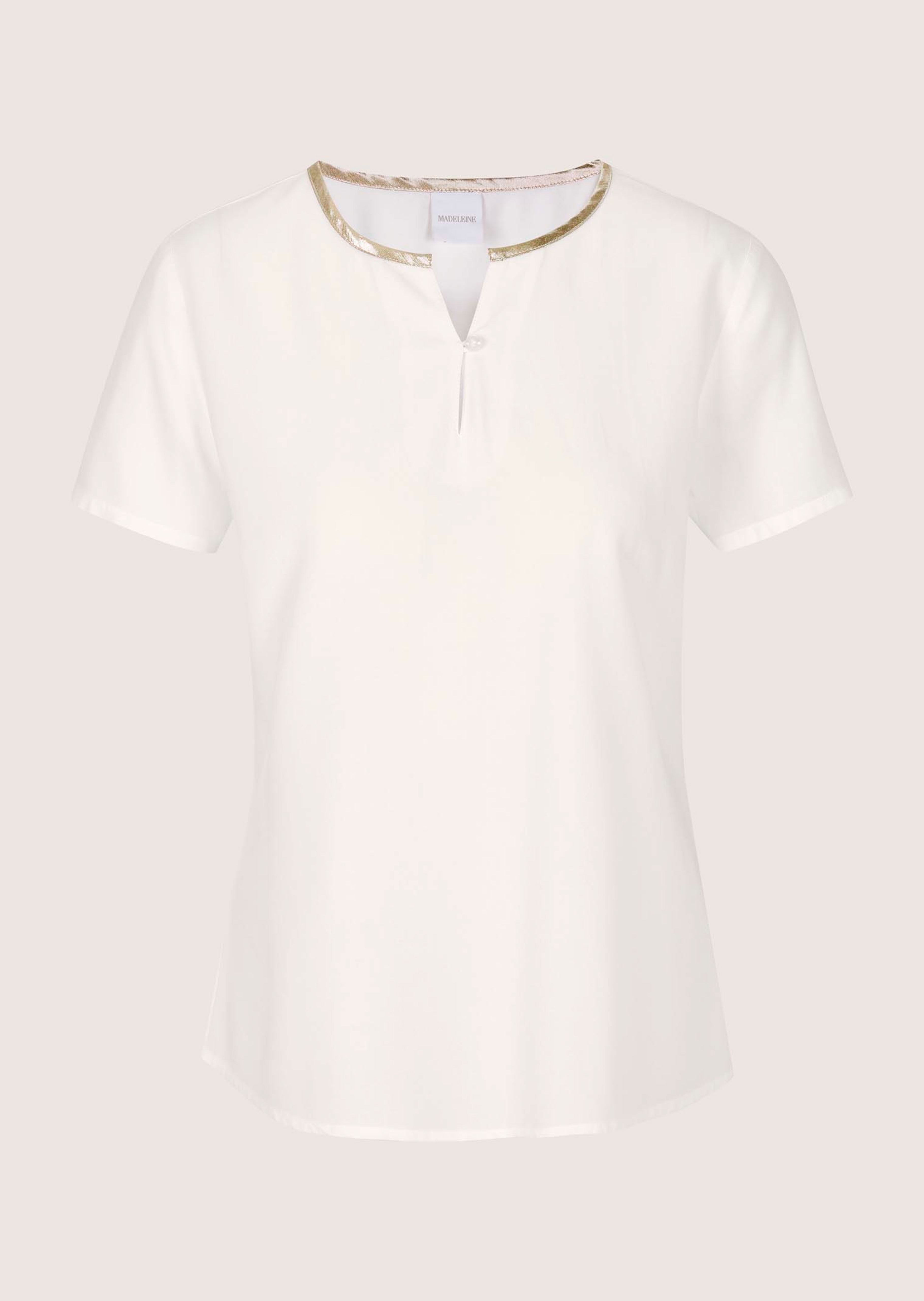 Een klein detail maakt het verschil: de contrasterende bies bij de hals benadrukt op elegante wijze de eenvoudige stijl. Met een ronde hals die uitloopt in een V-hals met een knoopje, halflange mouwen en in een casual pop-over stijl.
