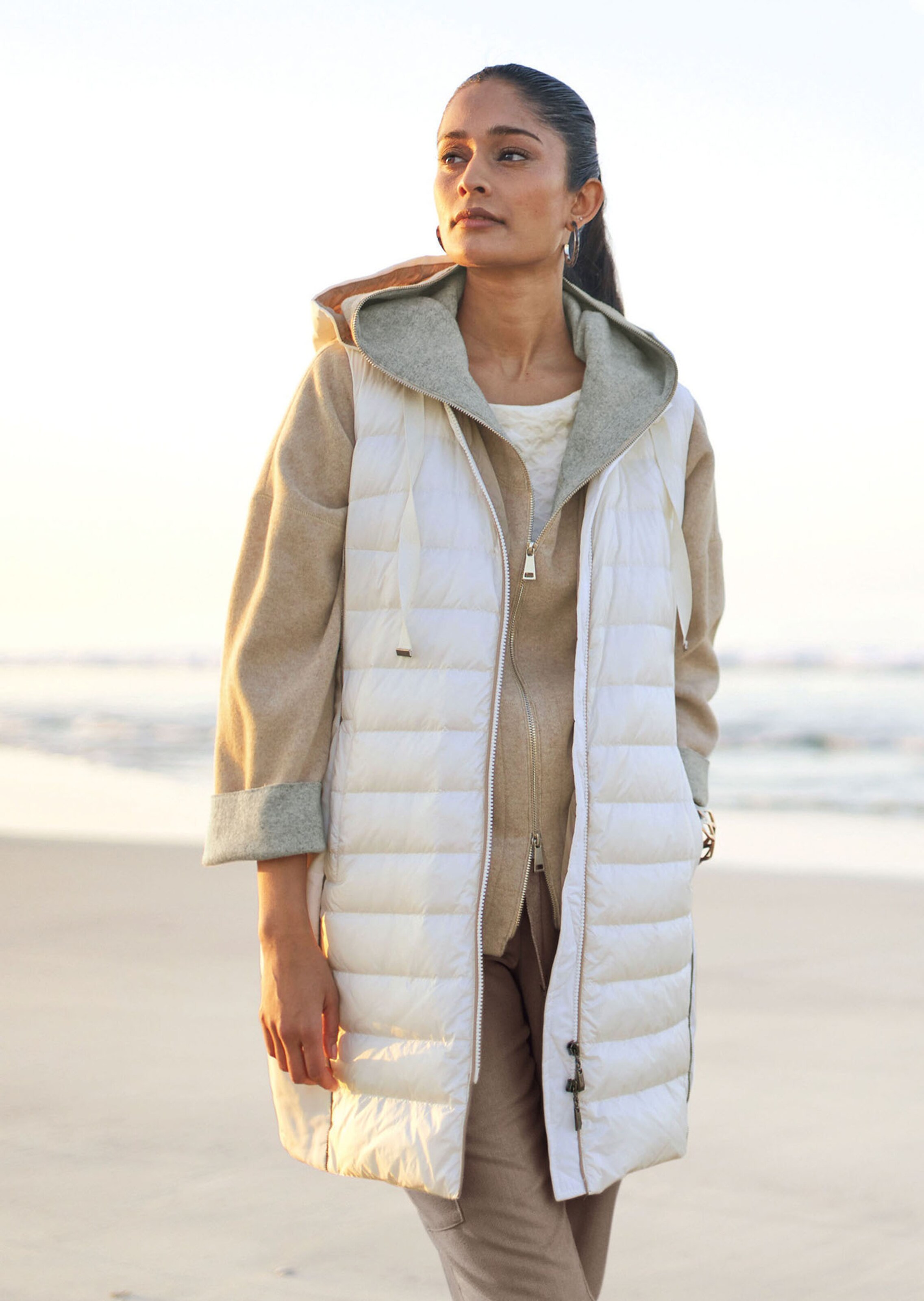 In een geraffineerde mix van materialen: aan de voor- en achterkant van doorgestikte polyamide met een zachte vulling van dons en veren, aan de zijkant in een gewatteerd gevoerde shape-memory-kwaliteit. Gedeeltelijke ripslinten, contrasterende paspels en fijne sierkettingen zetten chique accenten. Smal gesneden, licht getailleerd lang model met opstaande kraag, zakken in de naad en capuchon met tunneltje. Dit artikel is op basis van gerecycled materiaal grondstoffenbesparend geproduceerd.
