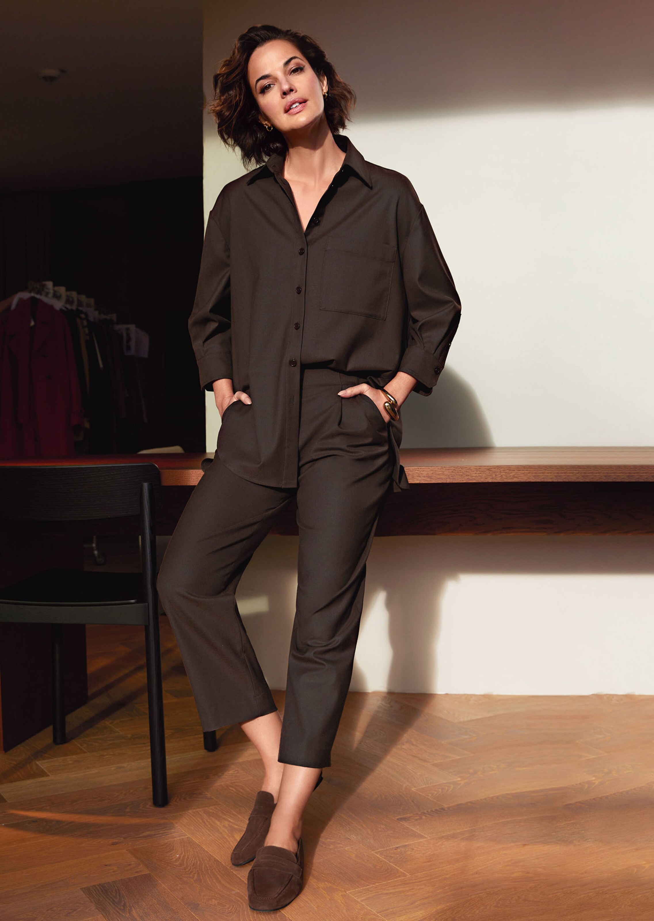 In modieuze 7/8-lengte. Aangenaam dragende stretchkwaliteit in populair highwaist-model met aangesneden tailleband, verzorgde, gestreken bandplooien en steekzakken. Gepaspeleerde sierzakken aan de achterkant met lusje en knoopje.