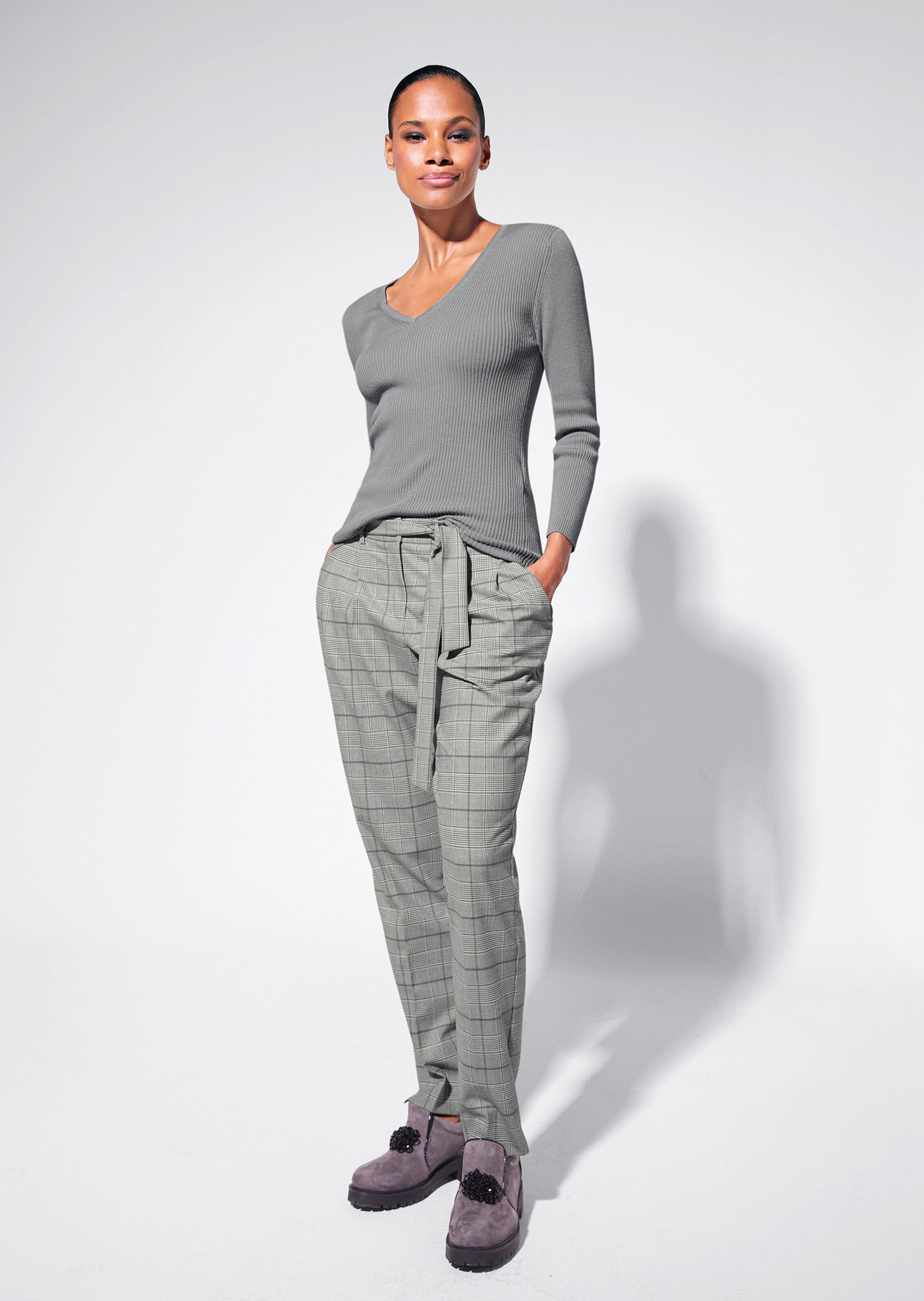 De trendy ruit maakt van deze bandplooibroek een must-have. Smal model met schuine steekzakken, bandplooien aan de voorkant en splitje opzij in de zoom van de pijpen. Tailleband met riemlusjes en bijpassende strikceintuur.