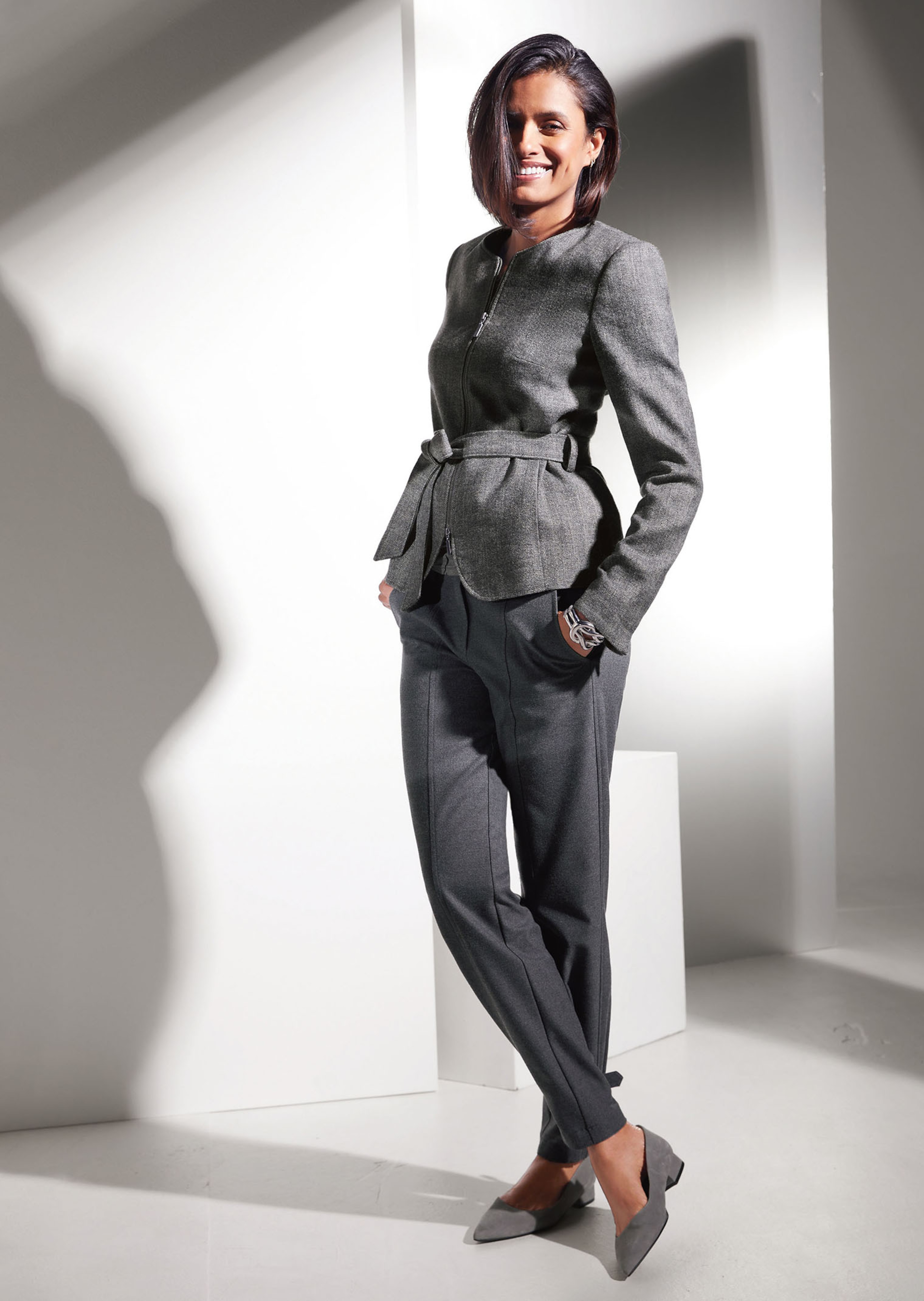 In taps toelopend model; comfortabel en aangenaam om te dragen. Met steekzakken, sierstiksels aan de achterkant en modieuze bandjes opzij ter regulering van de zoomwijdte. Tailleband met riemlusjes. Deelnaden aan de voor- en achterkant.