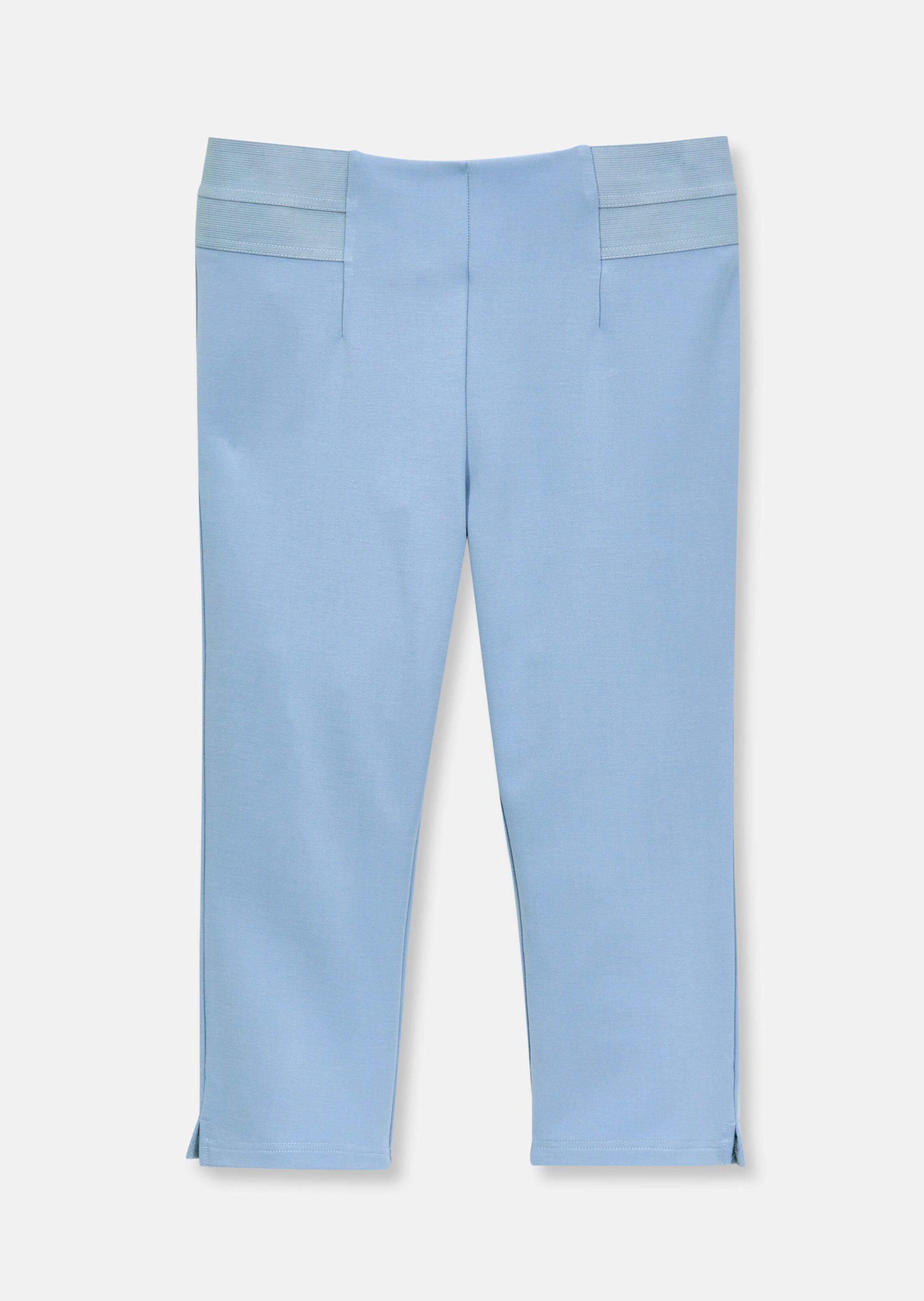 In capri-stijl; perfect voor nonchalant casual looks. De niet doorschijnende kwaliteit met stretch is flatteus en doet met elke beweging mee. Met elastische inzetten in de tailleband en kleine splitjes opzij in de zoom van de pijpen.