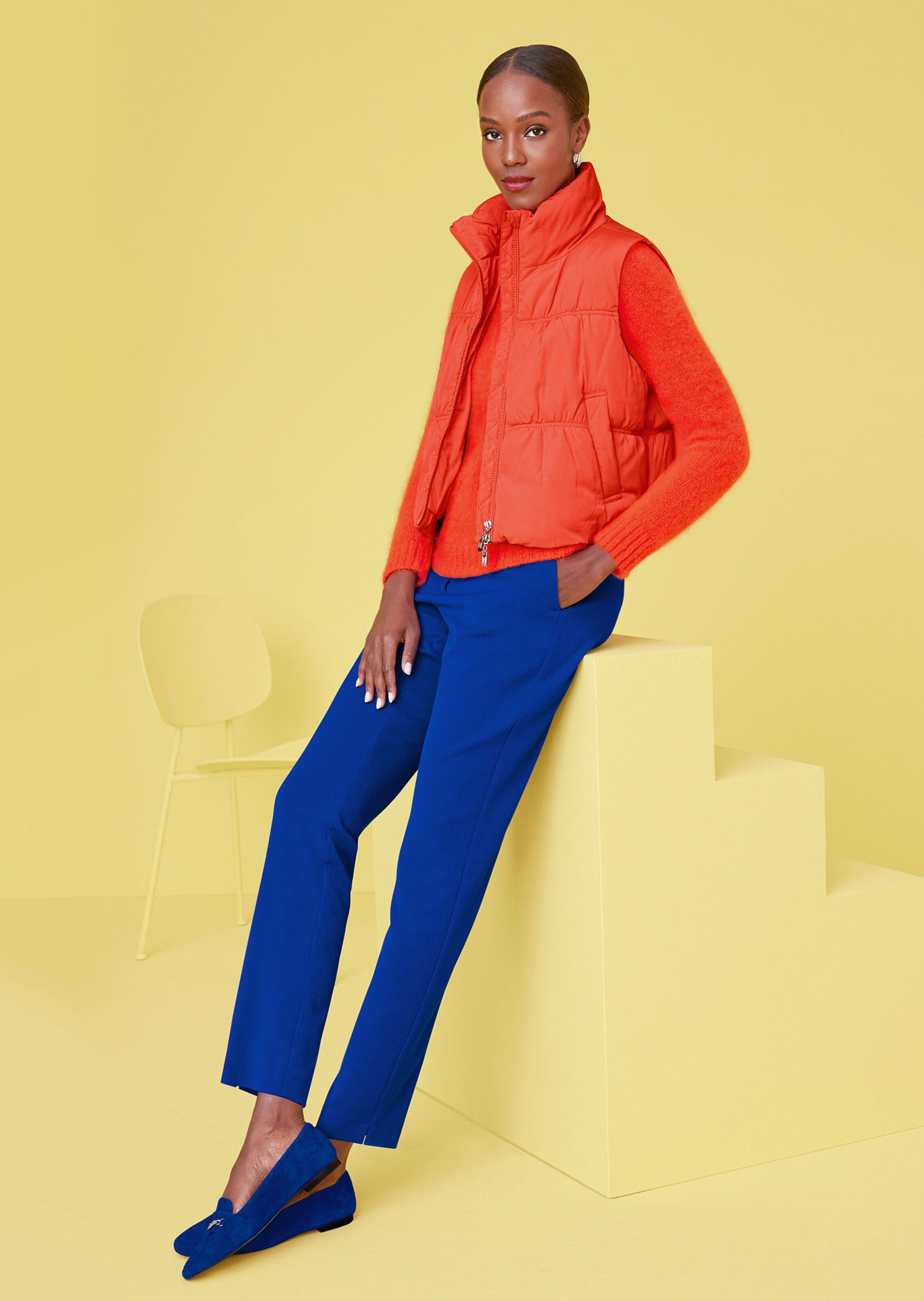 Smal gesneden stijl met modellerende tailleband, riemlusjes, haakjessluiting, steekzakken en splitjes opzij onderaan de pijpen.