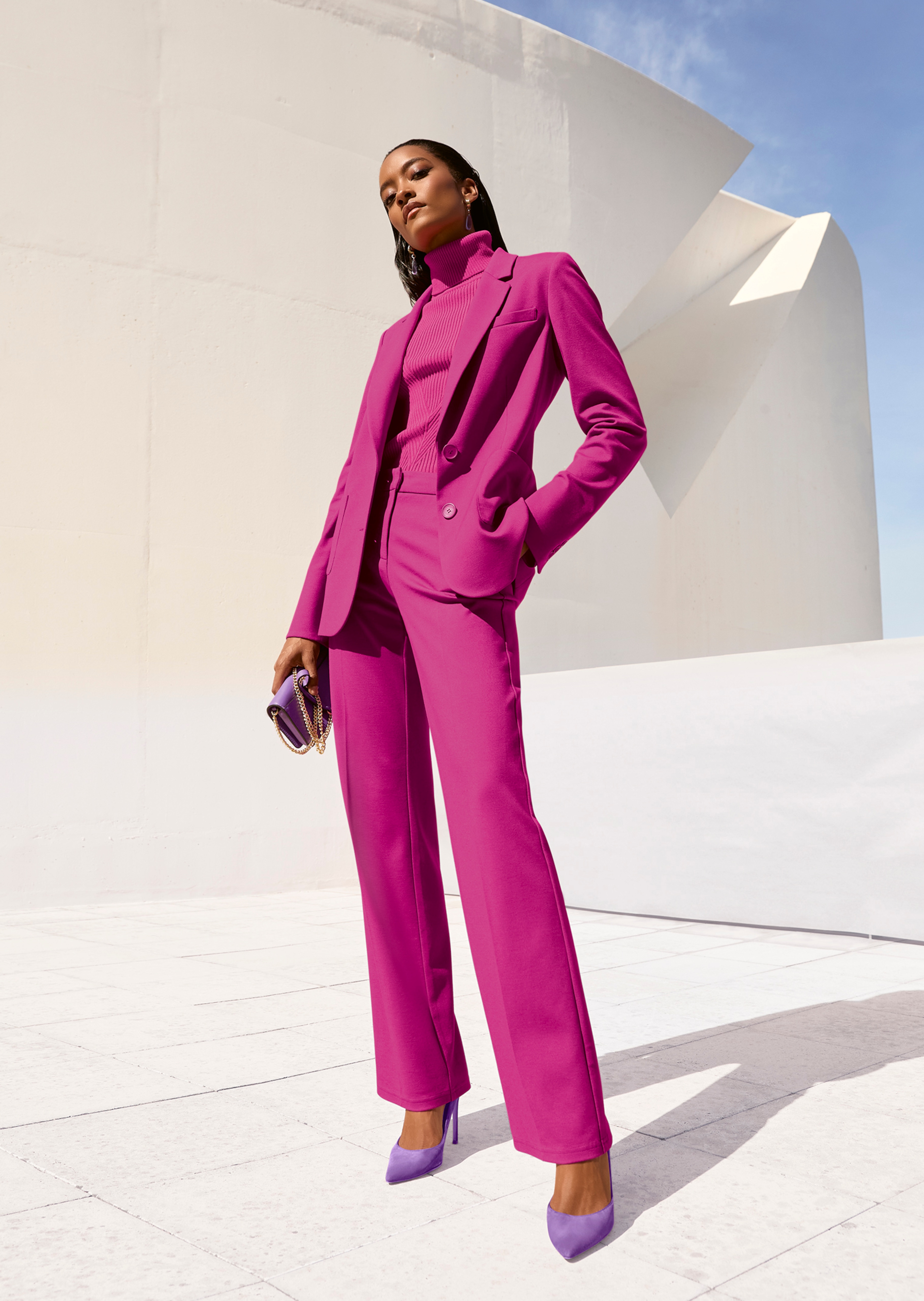 Comfortabele stretchbroek met nonchalant elegant wijde pijpen en verzorgde, gestreken vouwen. Voor met schuin ingewerkte steekzakken, aan de achterkant met decoratieve sierstiksels.