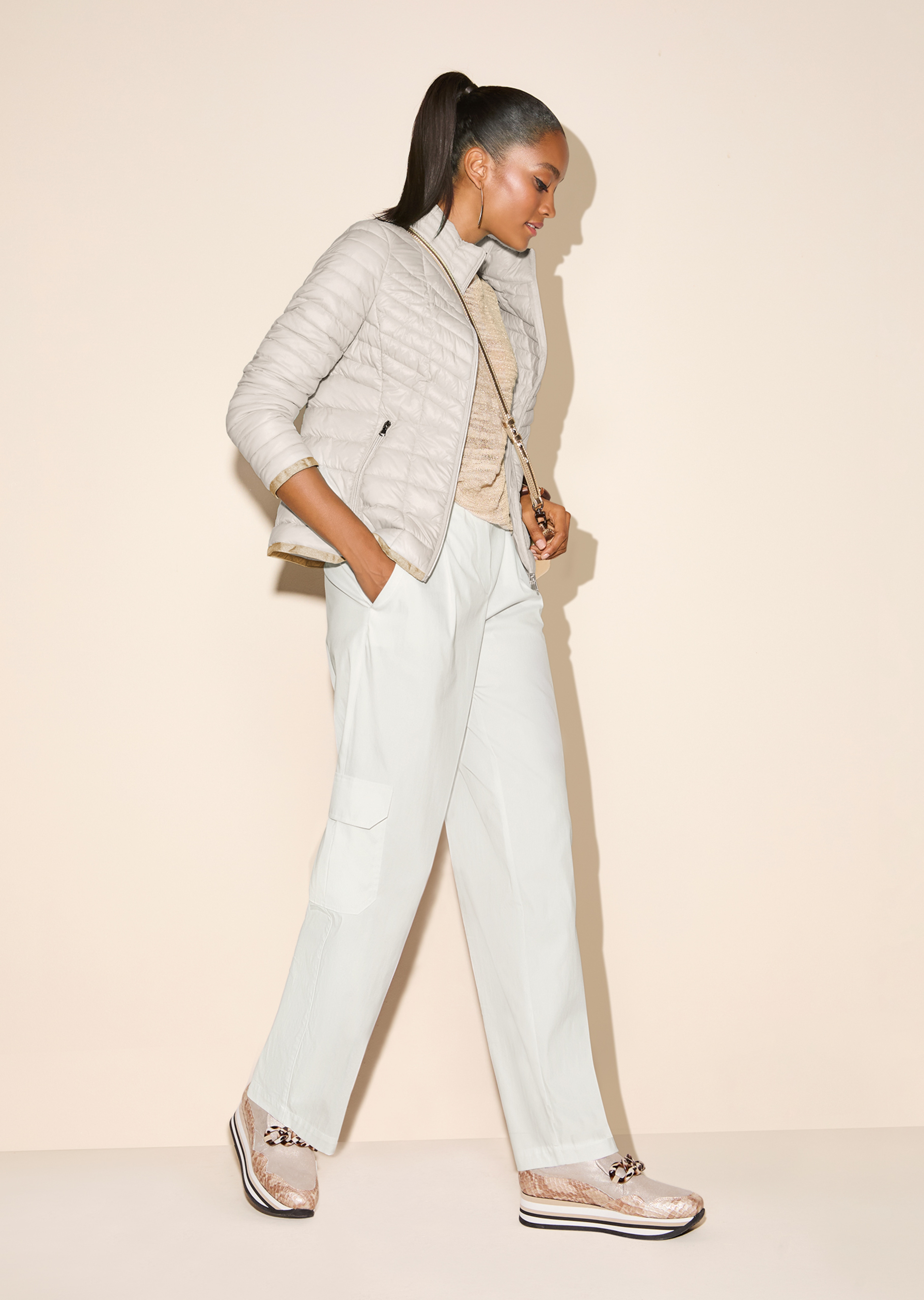Aangenaam lichte stretchkwaliteit in een nonchalant wijd, modieus cargo-model. Makkelijk pull-on model met een elastische tailleband, zakken opzij op de pijpen en bandplooien aan de voorkant. Schuine steekzakken. Fake strookzakken aan de achterkant.