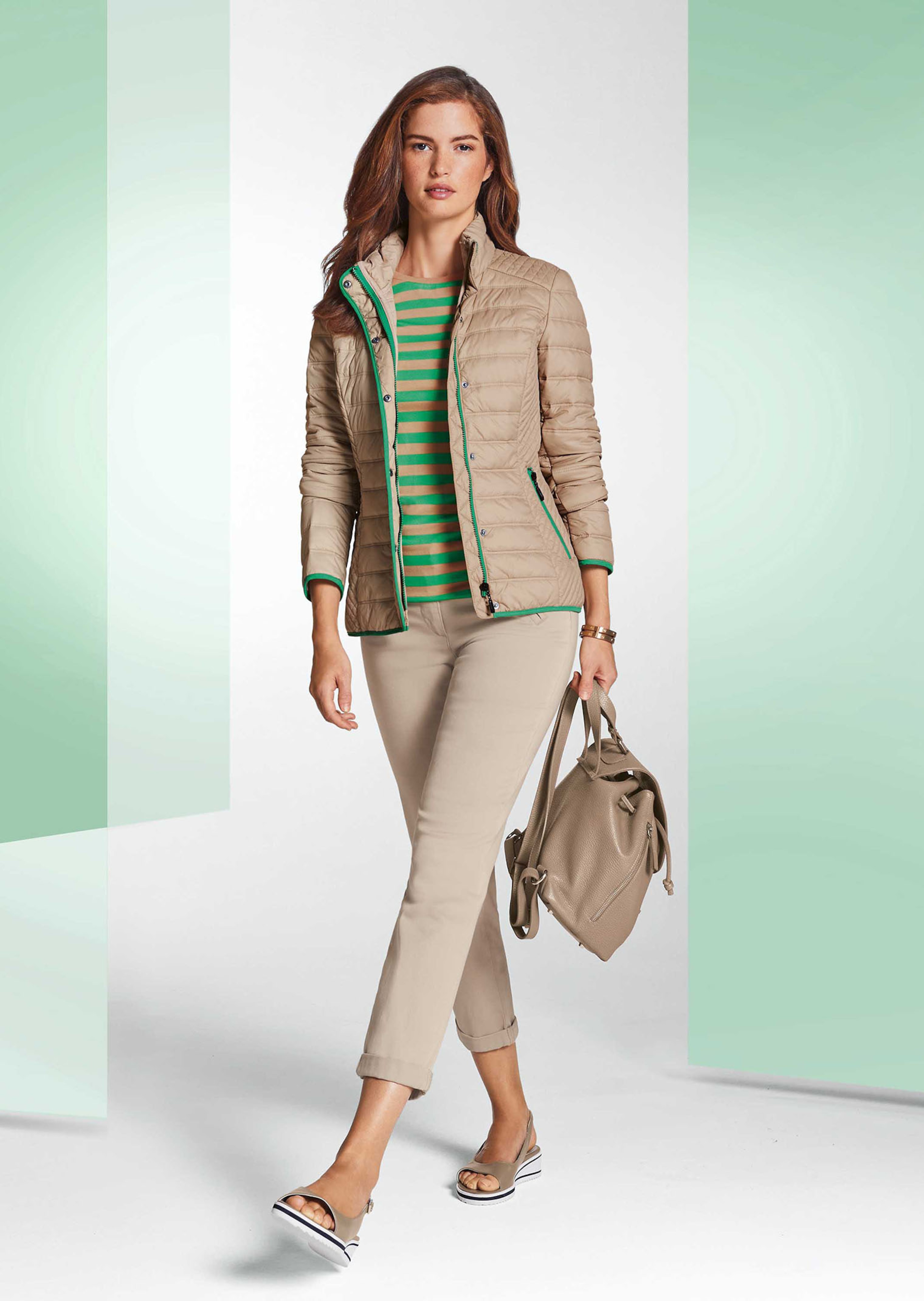 Licht gewatteerd. Met ronde hals, 2-weg-rits en lange mouwen met manchet en drukknoop. Capuchon en zoom met tunnelkoordje.