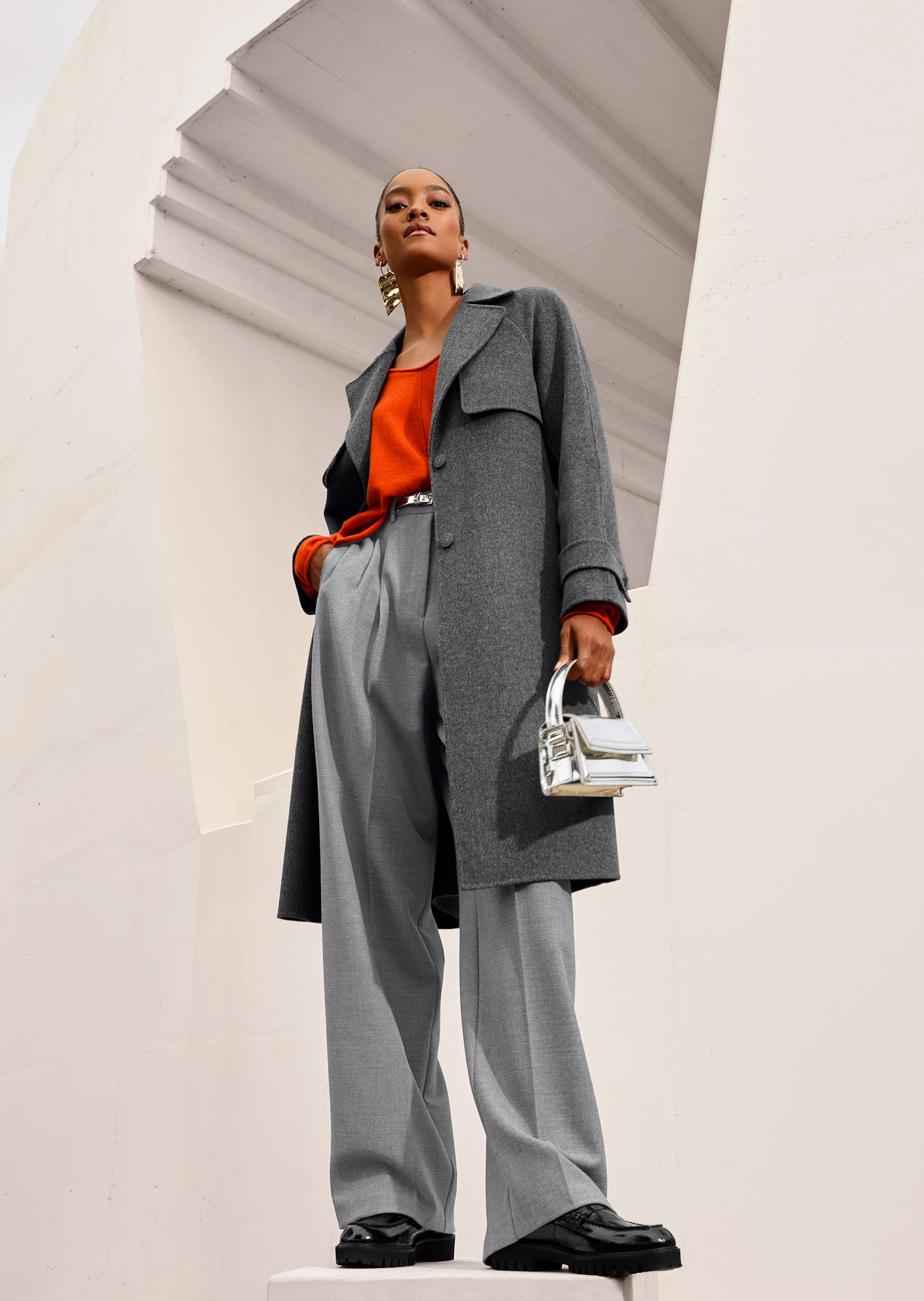 Chique wollen mantel in een hoogwaardige finish. Waardevol qua textuur en dankzij een gedeelte stretch supercomfortabel om te dragen. Met reverskraag, blinde drukknopen en decoratieve siernaden. Flap voor en mouwen met zoombandjes.