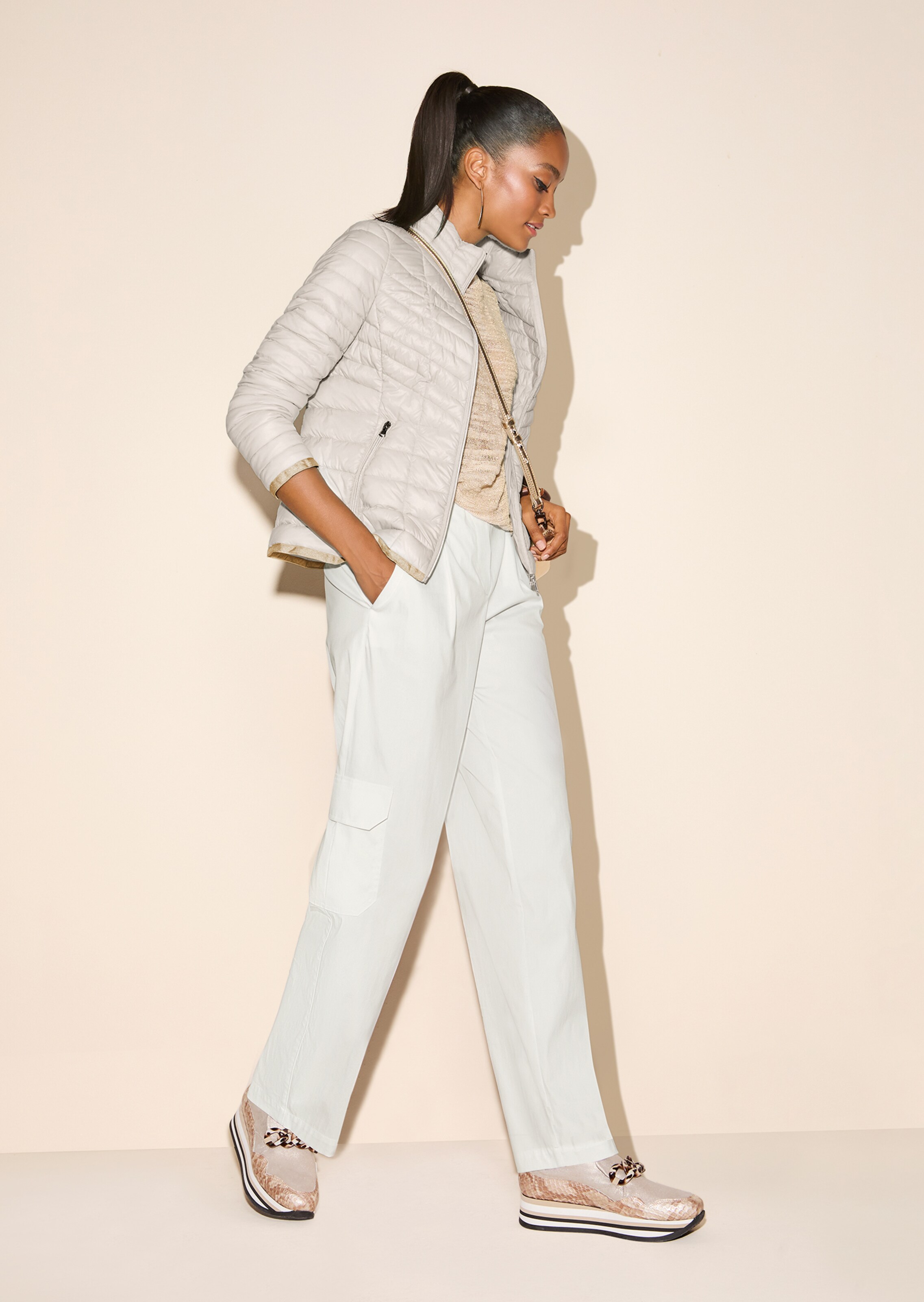 Subtiel gewatteerd, aangenaam licht, zomers doorgestikt jack in een licht getailleerd model met een opstaande kraag, lange mouwen, een ritssluiting aan de voorkant en ingewerkte zakken met rits. Glanzend ripslint aan de zoomboord.