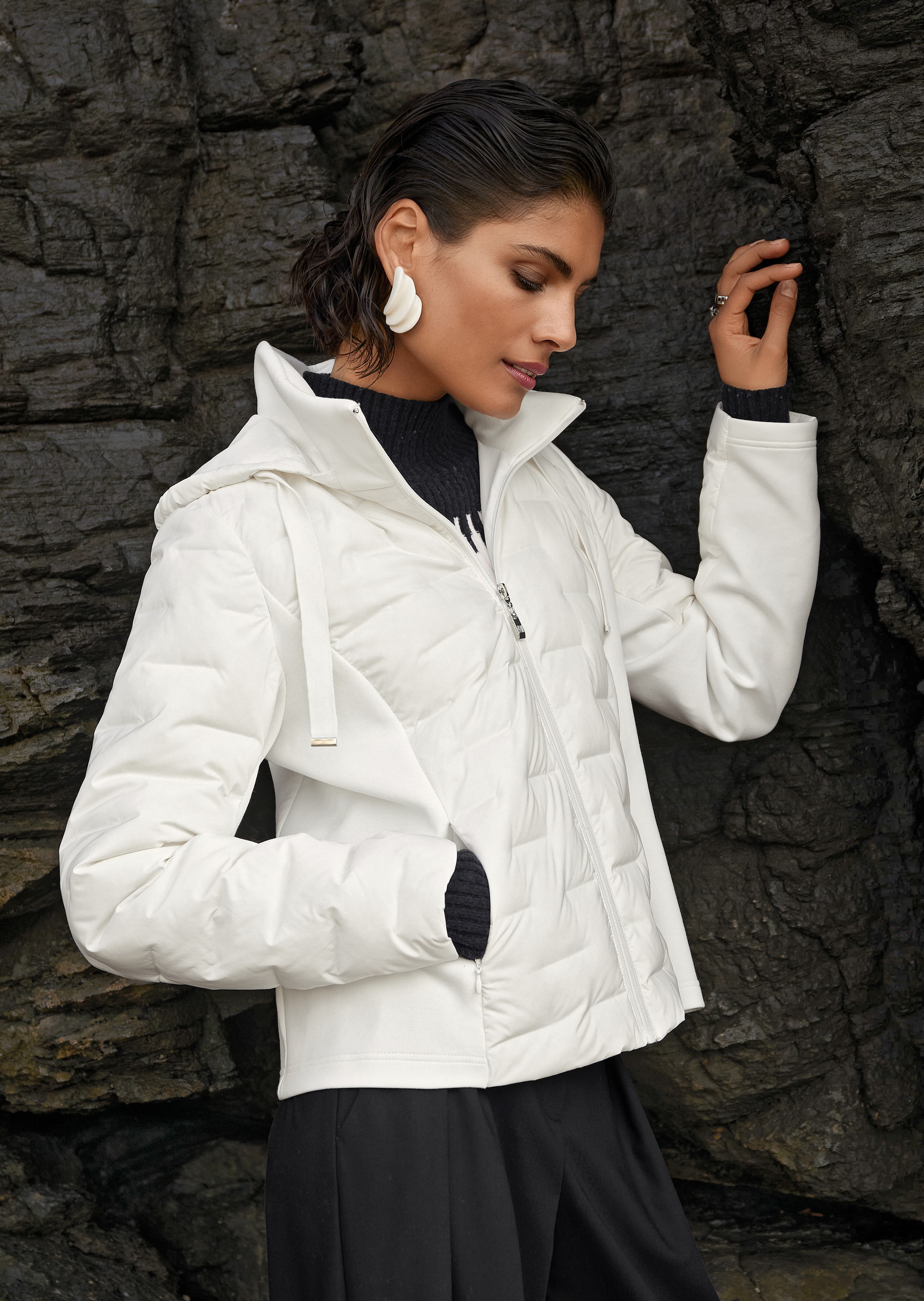 Modieuze materiaalmix van warme gewatteerde, doorgestikte stof en zachte scubastof. Aantrekkelijk kort model in een sportieve, elegante look met een hoge opstaande kraag, lange mouwen en geïntegreerde ritszakken. Ritssluiting aan de voorkant tot aan de kraag. Afneembare capuchon met geïntegreerd trekkoord.
