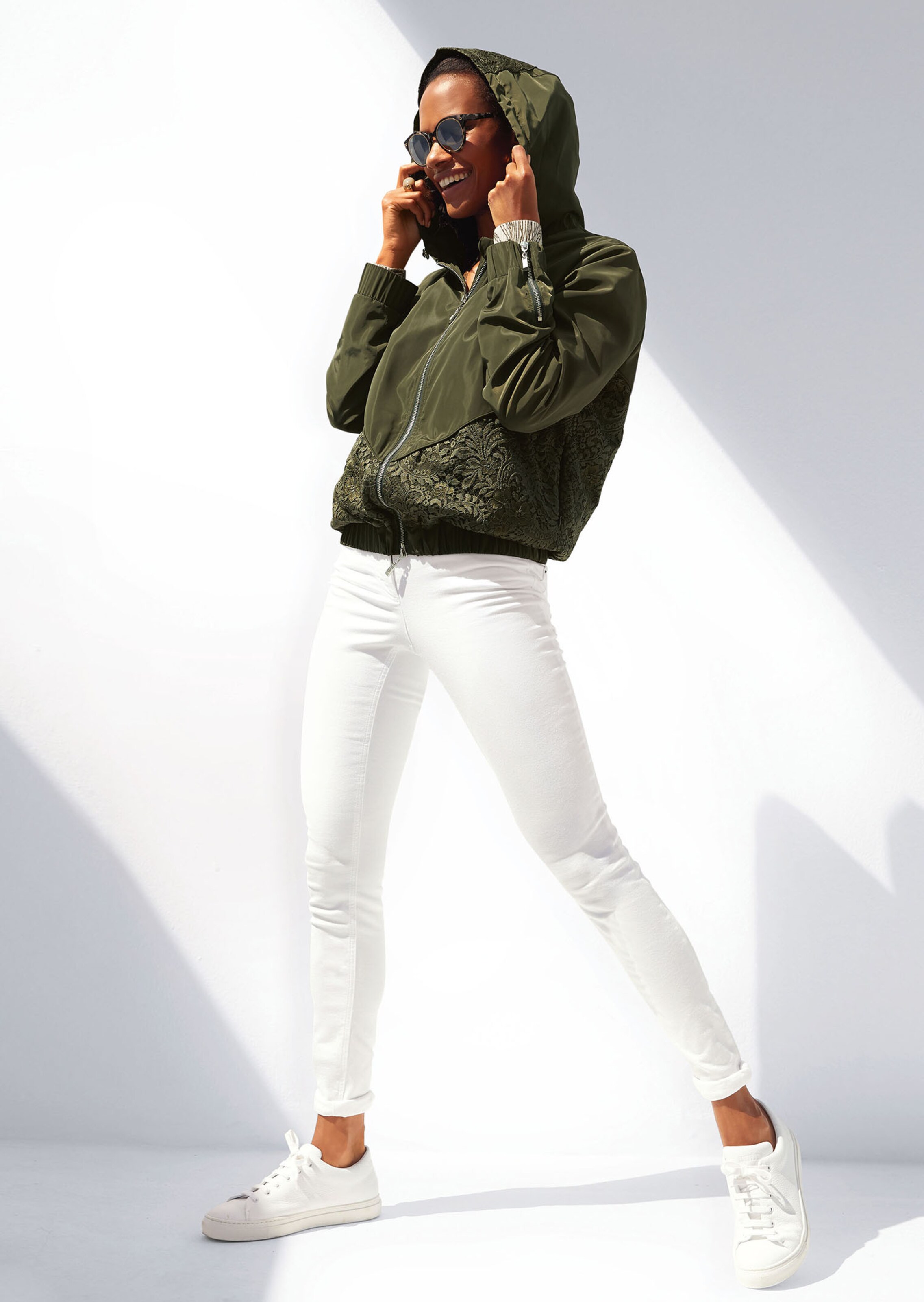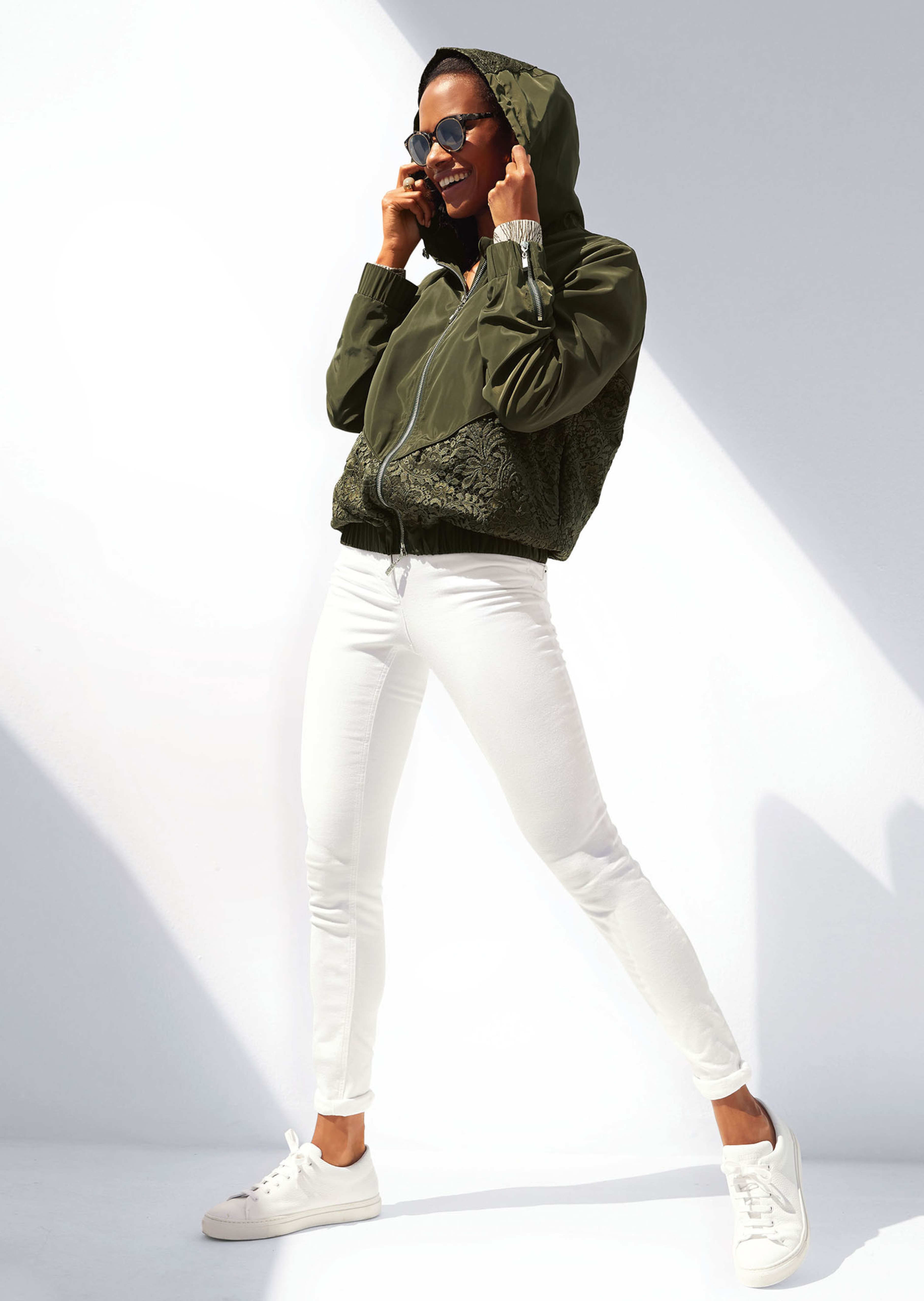 In nonchalante blouson-style met inzetten van kant aan de voorkant, de achterkant en de capuchon. Capuchon met tunnelkoordje en stoppers om individueel te reguleren. 2-weg-rits, mouwritsjes en rits van de zakken met een hanger met logo. Mouwen met een elastisch uiteinde. De zakken zijn mooi in de naad opzij geïntegreerd. Aangenaam lichte voering van mesh.