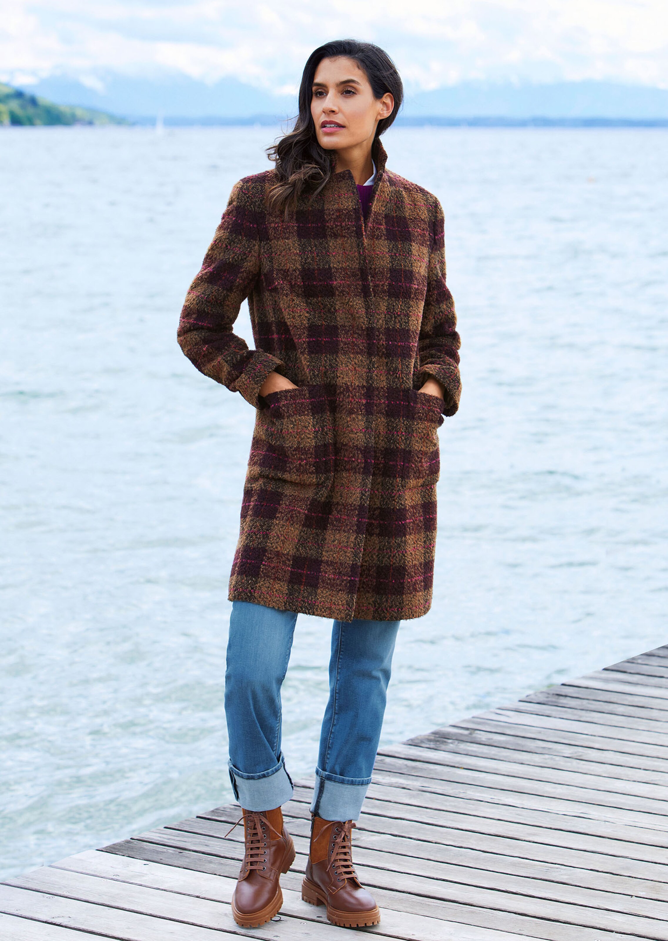 In een trendy ruit. Nonchalante stijl met reverskraag, lange mouwen, blinde drukknopen en grote, opgestikte zakken. Chique kwaliteitsmix met alpaca.