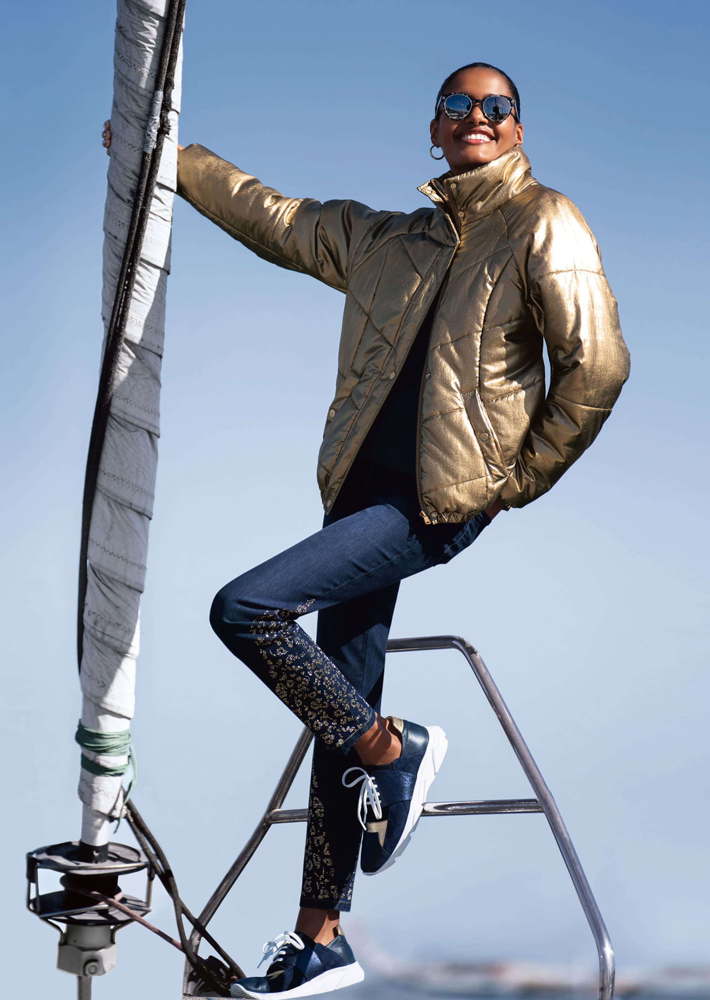 Een highlight in een trendy, metallic look! Winters warm gewatteerde blouson met stiksel en elastische uiteinden. Opstaande kraag, M-logodrukknopen, blinde rits en sierzakken.