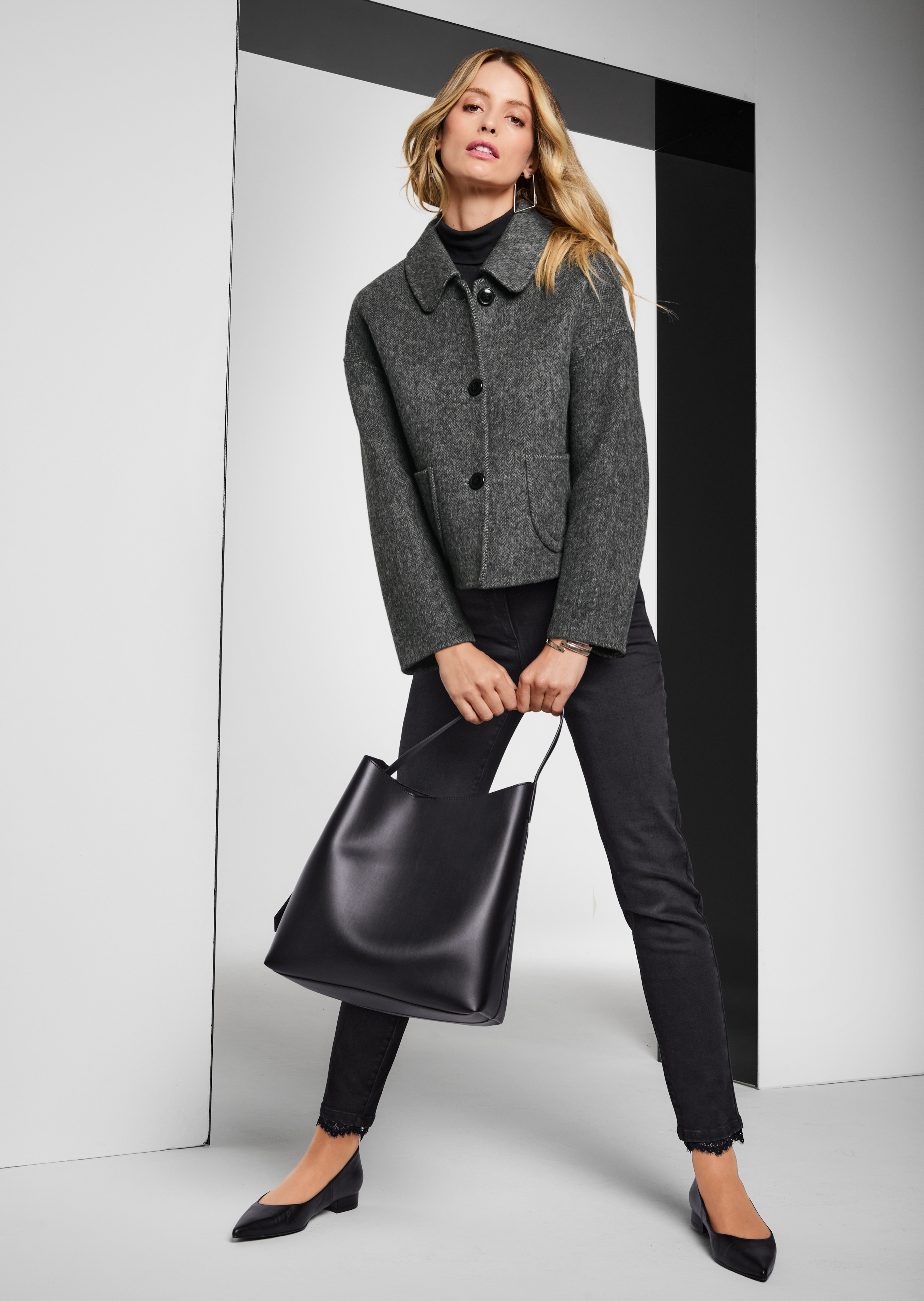 Modern boxy silhouet van fijne wollen velours met visgraatmotief. Met overhemdkraag, discrete knopenlijst en opgestikte zakken. Hoogwaardige double-face finish.