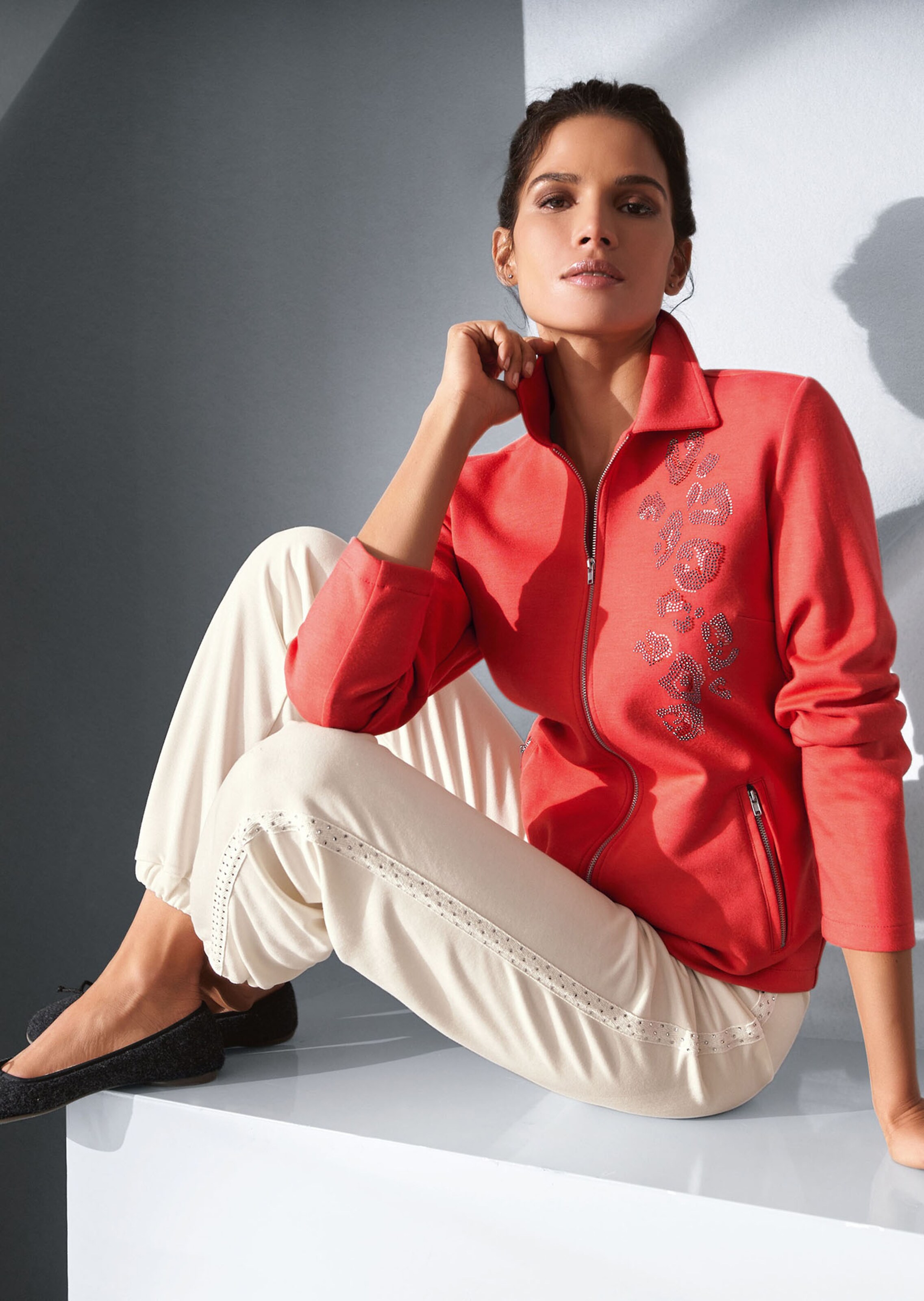 Perfect om in te relaxen! De decoratieve applicatie met strassteentjes aan de voorkant is een modieus extraatje. Aangenaam om te dragen en casual gesneden, en met lange mouwen, overhemdkraag, rits voor en schuine ritszakken.